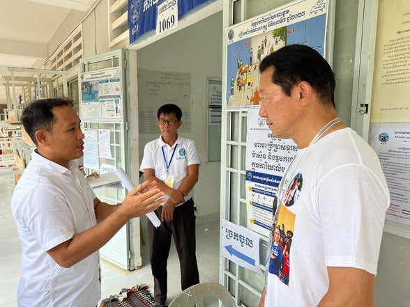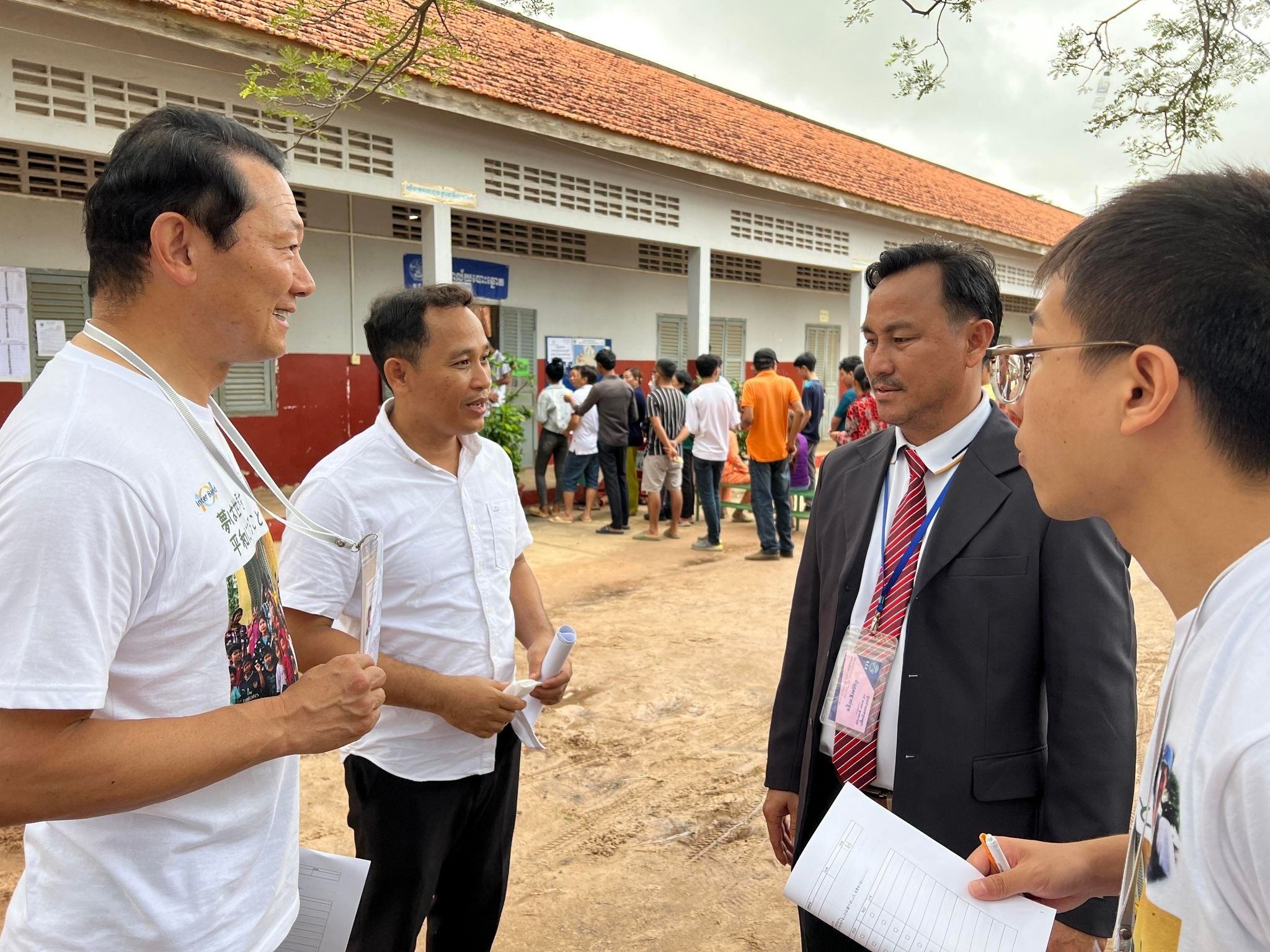今回は、弊団体理事の阪口直人(元衆議院議員、元UNTAC選挙支援要員)をはじめとする8名のインターバンド選挙監視団は、投票日当日の7月23日の投票所での監視活動に加え、7月12日からは、プノンペンにて、選挙前のヒアリングを行い、23日にはコンポントム州7箇所の学校、19の投票所にて投票プロセスの監視を行いました。