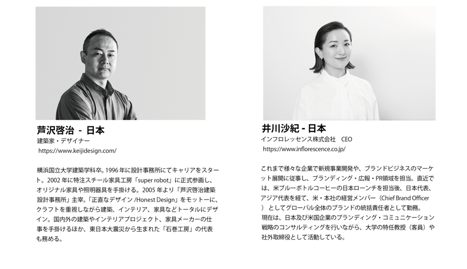 今回の審査員は芦沢啓治氏(建築家・デザイナー 芦沢啓治建築事務所主宰)、井川沙紀氏(ブルーボトルコーヒージャパン合同会社・インフロレッセンス株式会社 CEO)が務めた。