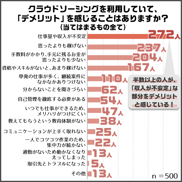 ●クラウドソーシングのデメリットで一番は「仕事や収入面の不安定さ」!