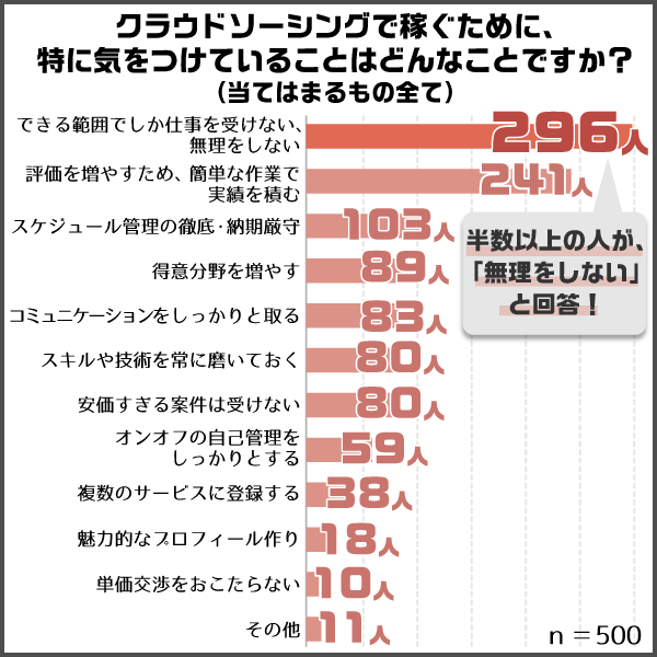 2番目に多かったのは「評価を増やすため、簡単な作業で実績を積む」という意見です。仕事を依頼したい人と受けたい人が手軽に出会えるクラウドソーシングですが、だからこそ「信用」が鍵となります。
