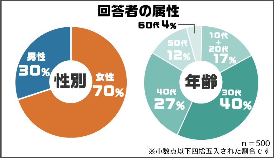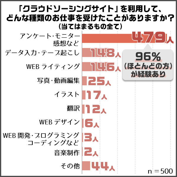 今回、アンケートに回答してくれたのは、男女合わせて500人です。クラウド上でのアンケートのため、全ての方が「クラウドソーシングでお仕事を受注したことがある」という方々です。