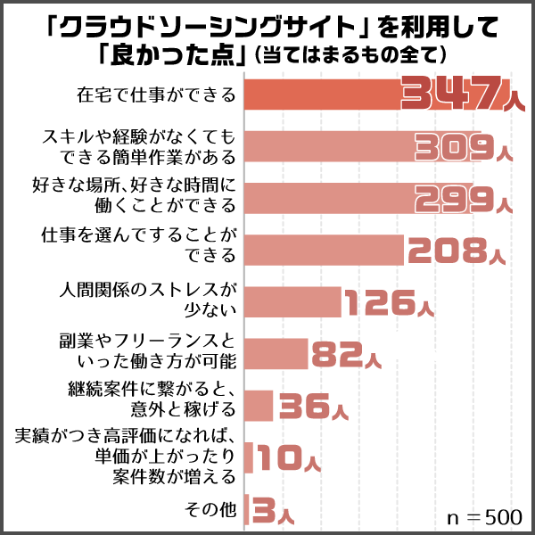 もっとも多くの人が選んだのは、在宅で仕事できるという理由です。家事、育児、介護で外に働きに出るのは難しいという方でも、「自宅で好きな時間」であれば仕事ができるという点は、大変魅力なのだと思います。