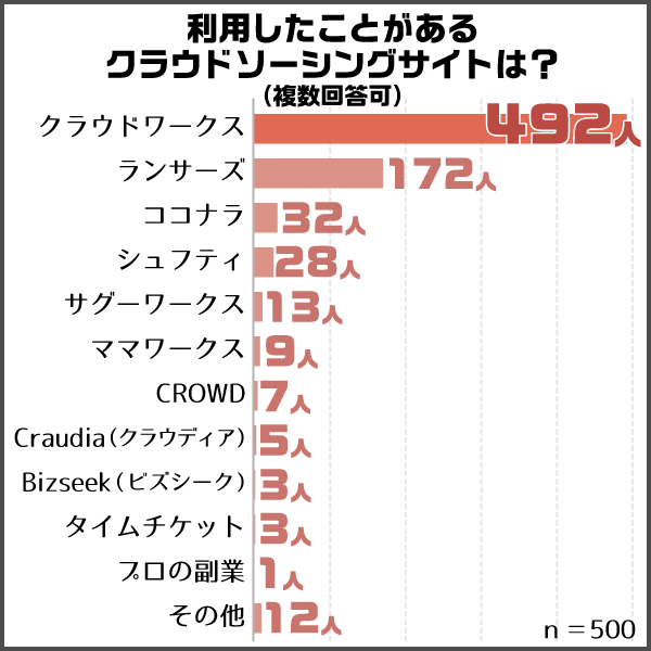 もっとも多くの人が利用しているのは、「クラウドワークス」。500人中492人が利用しているという結果で、圧倒的な支持率です。幅広い仕事内容に対応している点も、利用率が高い理由なのでしょう。