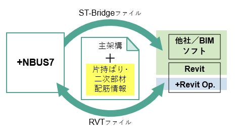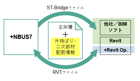 +NBUS7は、ST-Bridgeファイルを出力する他、+Revit Op.を介してAutodesk Revitの建物モデルを生成、またはRevitデータから構造モデラーの構造モデルを生成できます。 +NBUS7 Ver.3は、構造モデラーシリーズのデータファイルに片持ばりや二次部材の配筋情報をすべて保存しているため、ST-Bridgeや+Revit Op.を介してBIMデータに利用できます。
