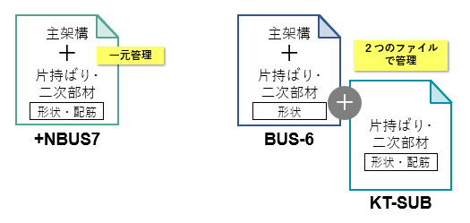 +NBUS7 Ver.3で入力した片持ばりや二次部材の配筋は、構造モデラーシリーズのデータファイルにすべて保存・管理されます。 これらのデータはBUS-6とKT-SUBの連携では別々に管理されていましたが、ひとつにまとまります。