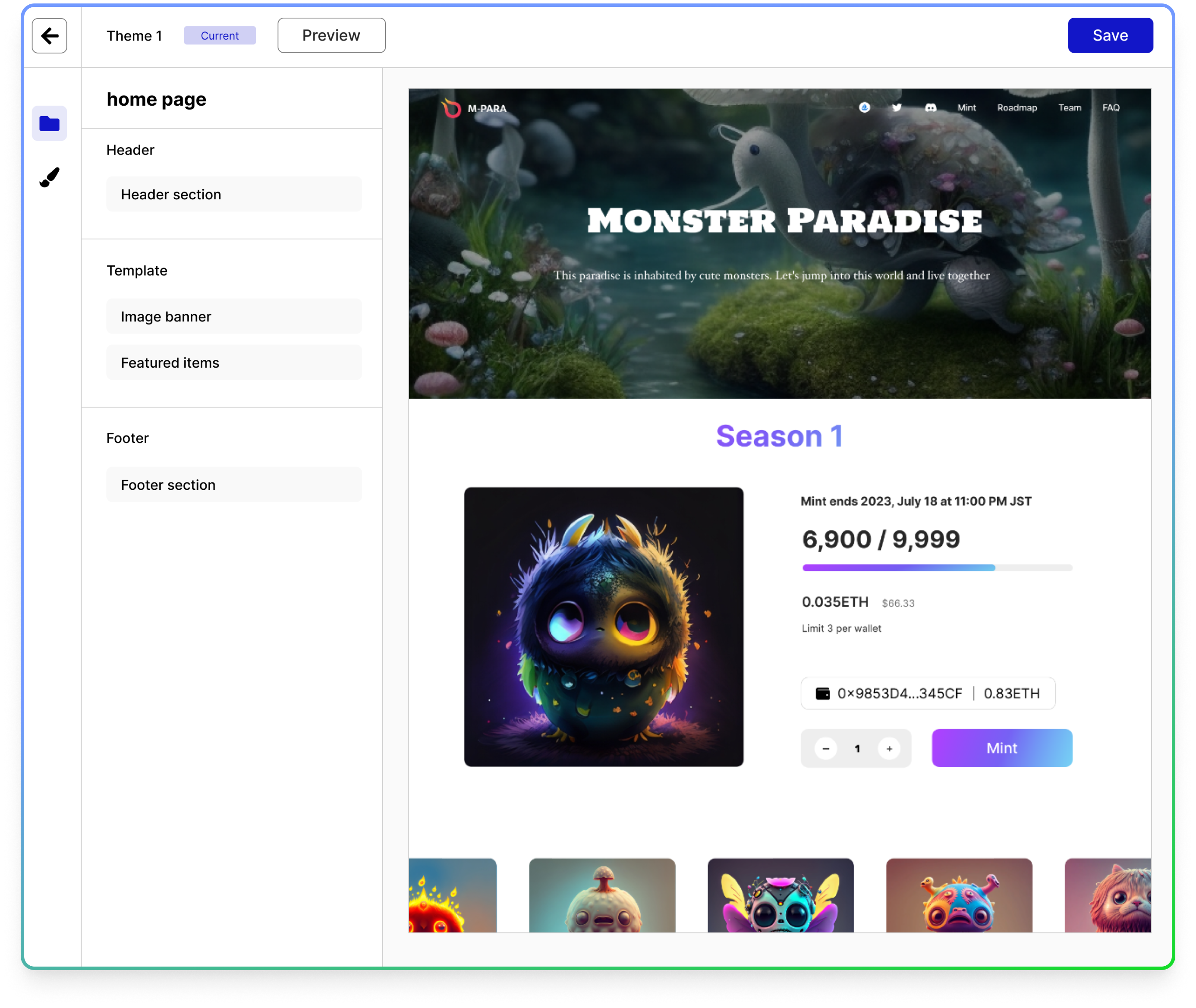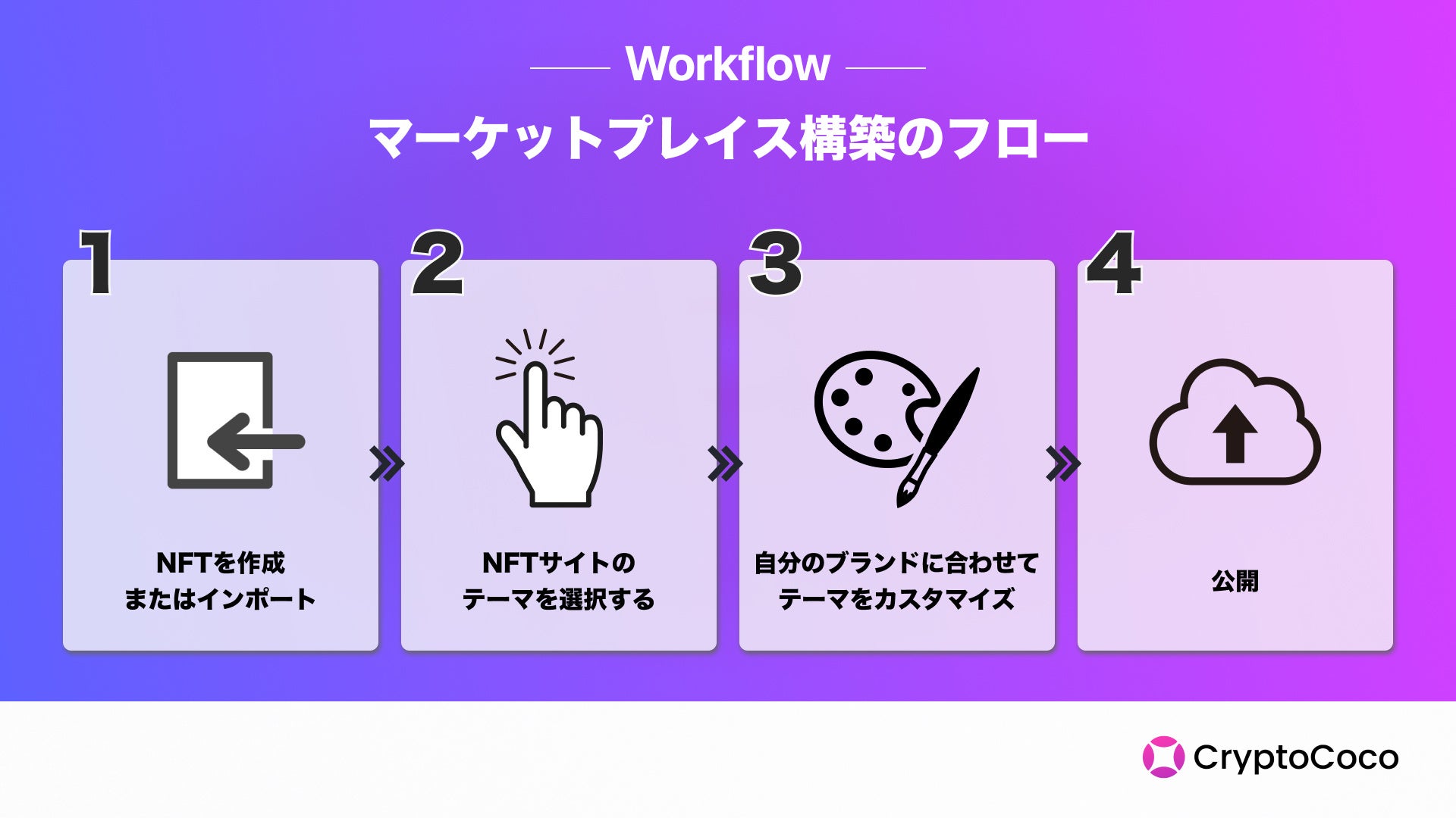 CocoShopは、NFTの作成からNFTミントサイト、マーケットプレイスの構築、NFTのプロモーションやマーケティングまで、NFTプロジェクトの立ち上げに最適なプラットフォームです。