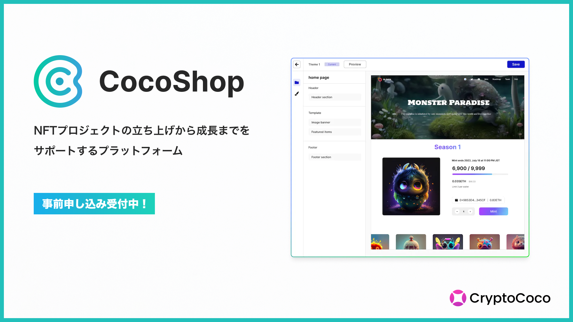 そこで、NFT独自のマーケットプレイスを運営してプロジェクトが確実に二次流通の手数料(ロイヤリティ)を確保するとともに、一次流通での売り上げも重視する必要があると考えており、NFTミントサイトやNFTストアの構築も可能な「CocoShop」を提供します。