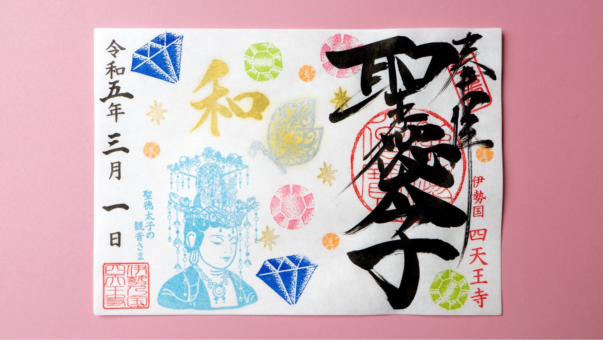 3月限定御朱印は、観音さまを彩る宝石と、額の蓮の花にとまる蝶々をあしらいました。