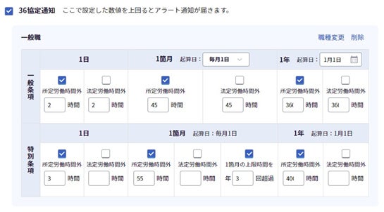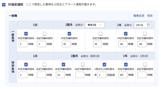 ・36協定の上限時間を職種によって異なる時間にしている場合に対応すべく、職種ごとにアラート設定可能に。