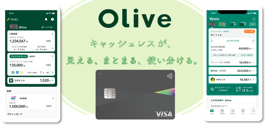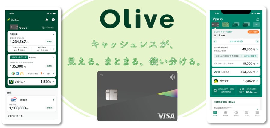 2023年3月からスタートした「Olive(オリーブ)」は、銀行口座、カード決済、ファイナンス、オンライン証券、 オンライン保険などの機能を、アプリ上でシームレスに組み合わせた新しいサービスです。三井住友銀行アプリ、三井住友カードのVpassアプリの双方から各種サービスへのアクセスが可能となり、日常的な決済や資産形成・運用等の各種サービスの残高や明細をまとめて管理することができます。また利便性だけでなく、Oliveアカウントで給与を受け取れば毎月一定額のVポイントの付与、振込手数料が無料になるなど、各サービスの利用状況に応じたポイントアッププログラムをご用意しておりますので、お得にポイントを貯めて無駄なく使うことができます。また、1枚のカードでキャッシュカードとクレジットカード、デビットカード、ポイント払いの機能をアプリで切り替えできる「フレキシブルペイ」を搭載し、カードはナンバーレス仕様のため安心・安全にご利用いただけます。