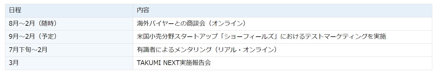 ジェトロが連携する海外バイヤー(セレクトショップなど)とのオンライン商談のほか、海外でのテストマーケティング、インスタグラムでの発信などを通じ、販売、広報での支援を行うとともに、ブランディング、アジア・欧州・北米それぞれの市場に精通したメンターから、現地市場のトレンドや各市場における強み・弱みの分析、商品の魅せ方などをアドバイスするグループセッションを実施している。また、NY NOWなど海外での広報ブースの出展も昨年度は実施した。過去のTAKUMI NEXTプログラムを通じて海外展開に成功した事業者へのインタビューはジェトロ活用事例を参照。
