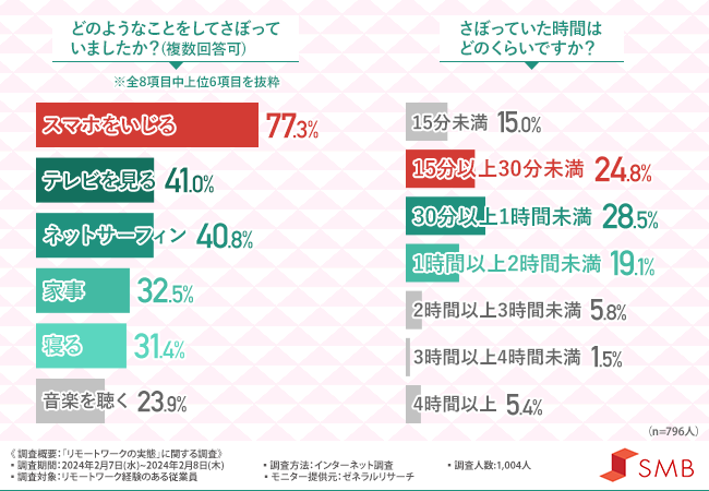 「どのようなことをしてさぼっていましたか?(複数回答可)」と質問したところ、『スマホをいじる(77.3%)』と回答した方が最も多く、次いで『テレビを見る(41.0%)』『ネットサーフィン(40.8%)』と続きました。
