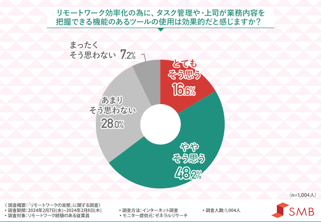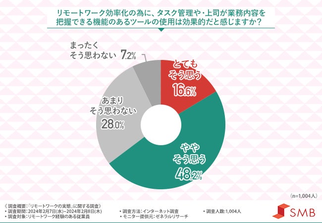 最後に「リモートワーク効率化の為に、タスク管理や・上司が業務内容を把握できる機能のあるツールの使用は効果的だと感じますか?」と質問したところ、『とてもそう思う(16.6%)』『ややそう思う(48.2%)』と続きました。