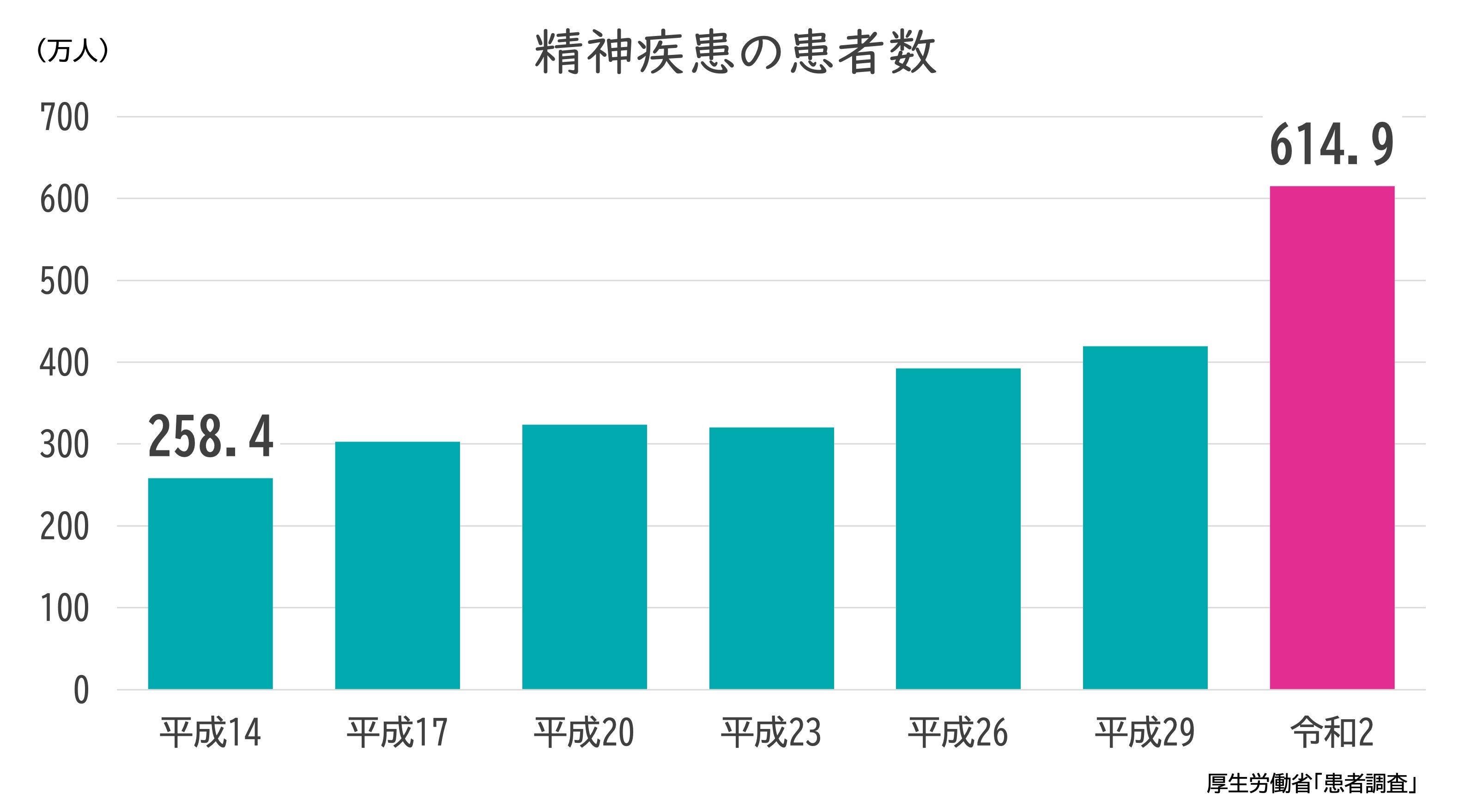 厚生労働省によると精神疾患の患者数は増え続ける傾向にあり、企業様においては従業員の休職や離職の影響で損失が発生し、経営リスクとなる可能性も考えられます。