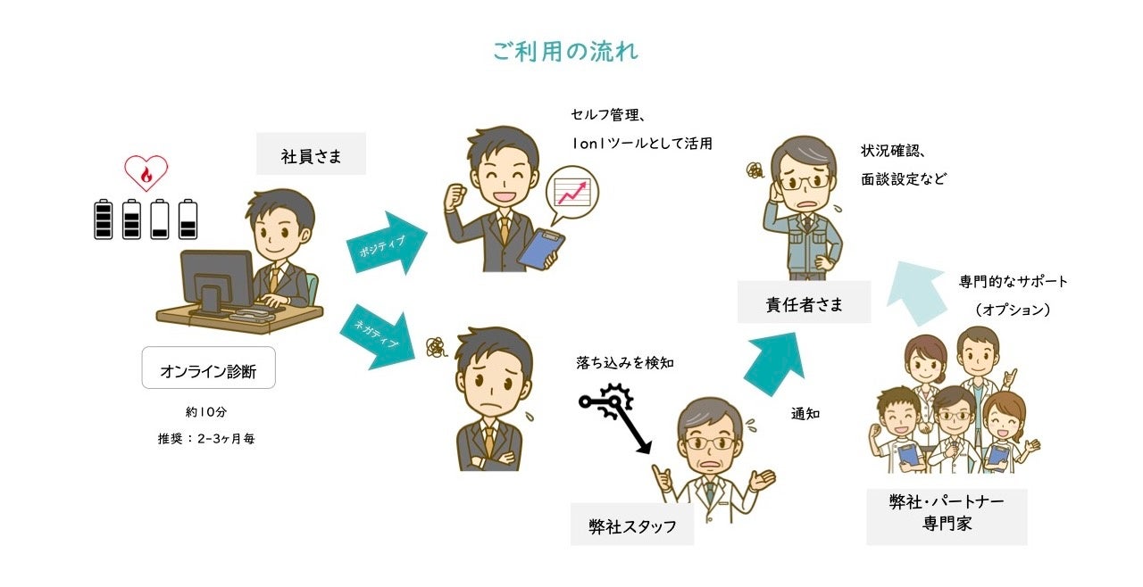 導入いただく企業様は2〜3ヶ月に一度、従業員様に1回10分程度のオンライン診断を受けていただきます。