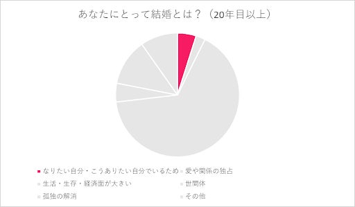 色のついた部分が、「結婚=なりたい自分・こうありたい自分でいるため」と回答した人の割合です。結婚1~5年目で大きく割合が増え、一方20年目以上では「生活・生存・経済面」が多くを占めることが見て取れるのではないでしょうか。