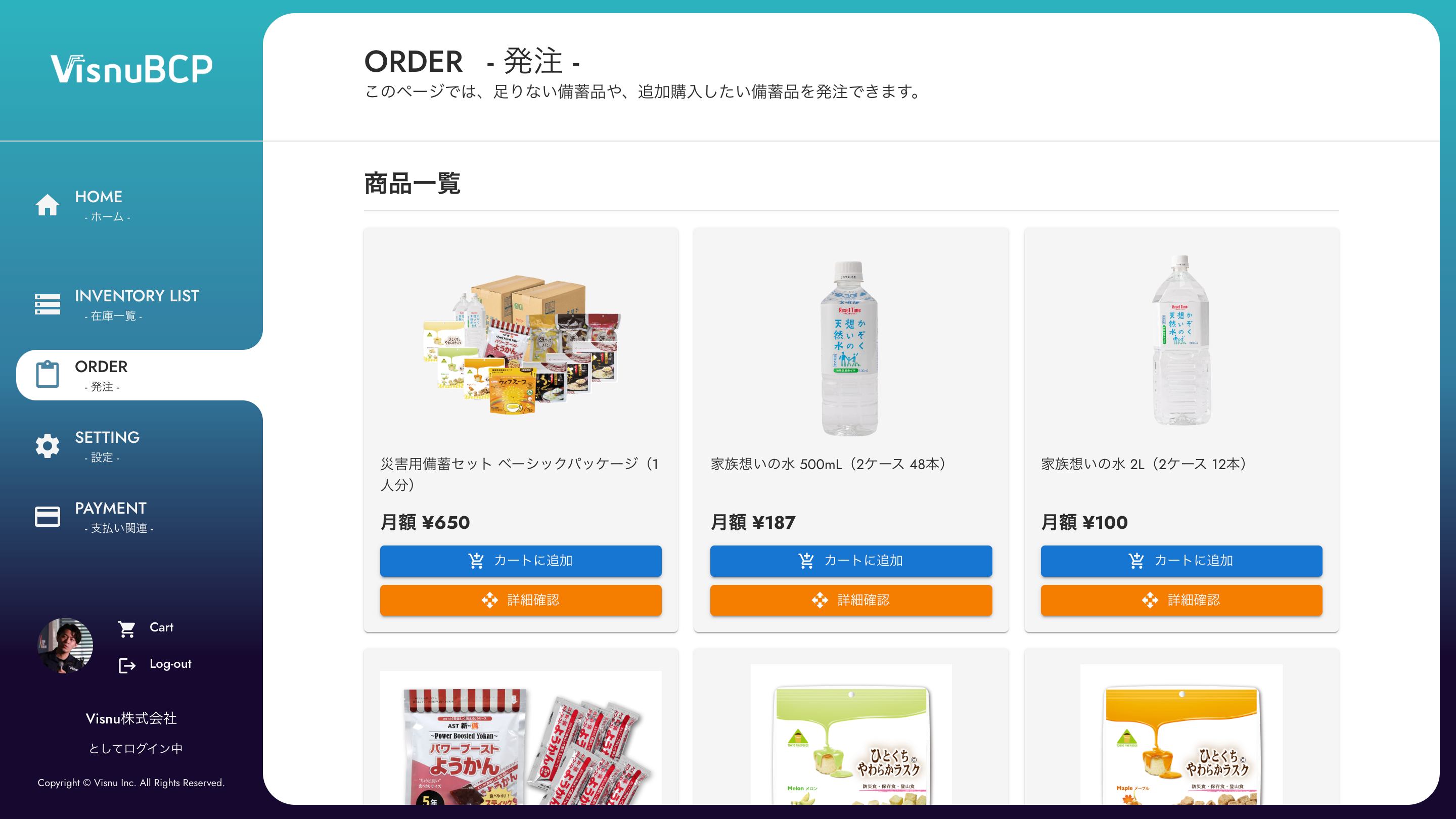 VisnuBCPダッシュボードから、備蓄商品の発注も受け付けております。BCP専門家の監修により、水・食料・トイレ等の必需品がセットになった独自の備蓄品パッケージから、個別商品購入まで対応することで、速やかに災害備蓄運用を開始できるスキームを整えております。