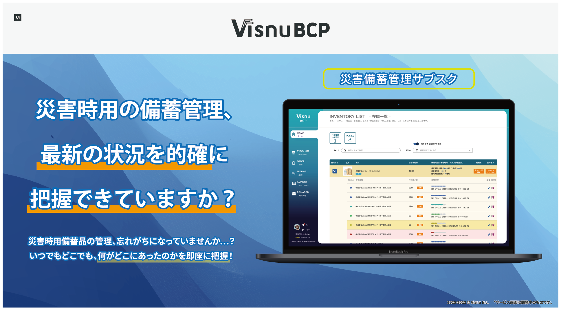 VisnuBCP(ヴィシュヌ・ビーシーピー)は、災害備蓄品の管理業務をクラウド連携で自動化し容易にすることが可能なサブスクリプション型のクラウドサービスです。