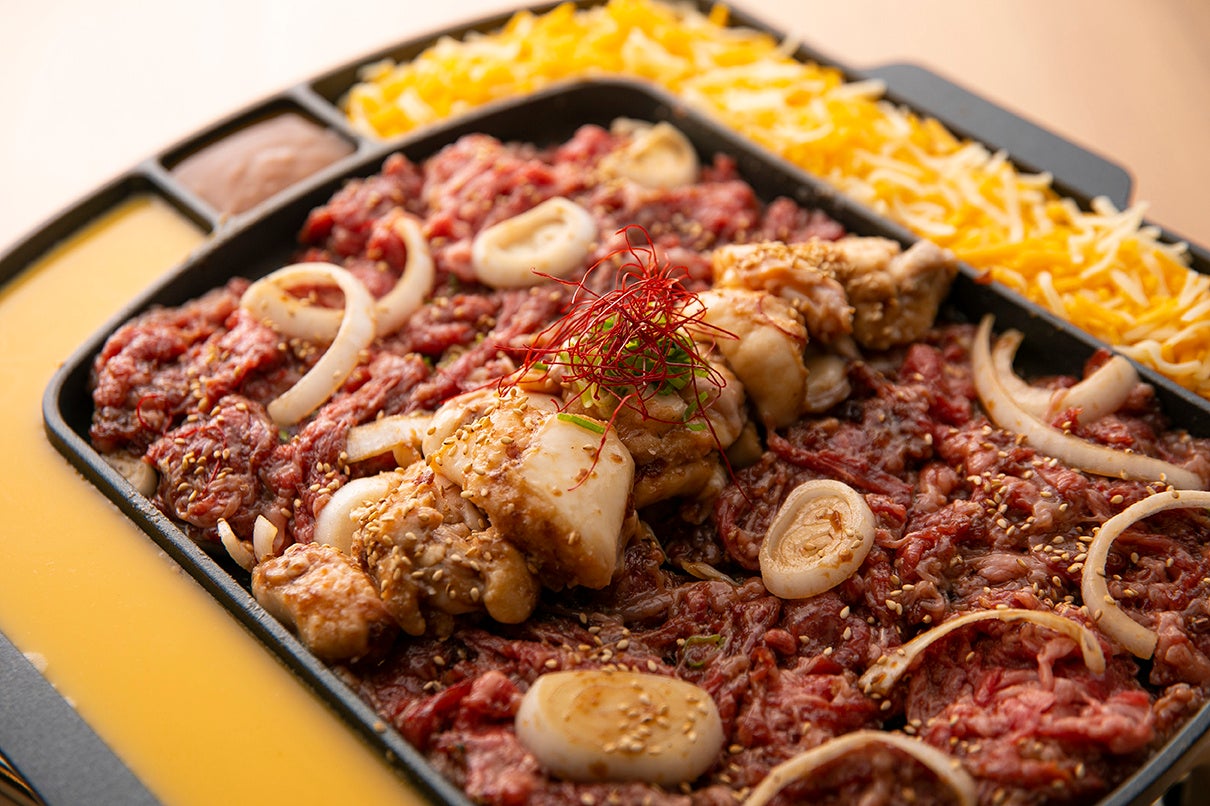 鉄板の真ん中に但馬牛。両脇の溝にはチーズとケランチムがセットされます。