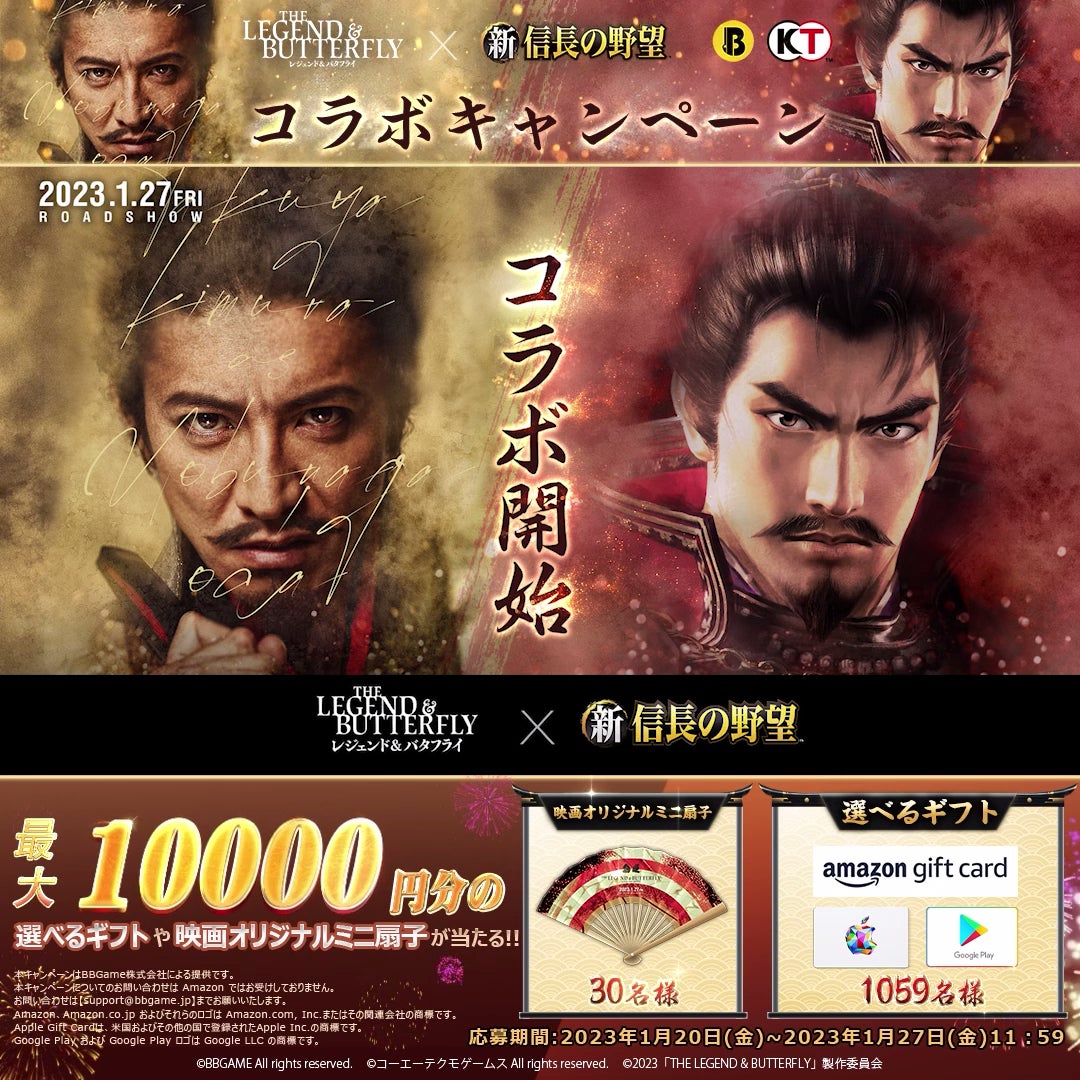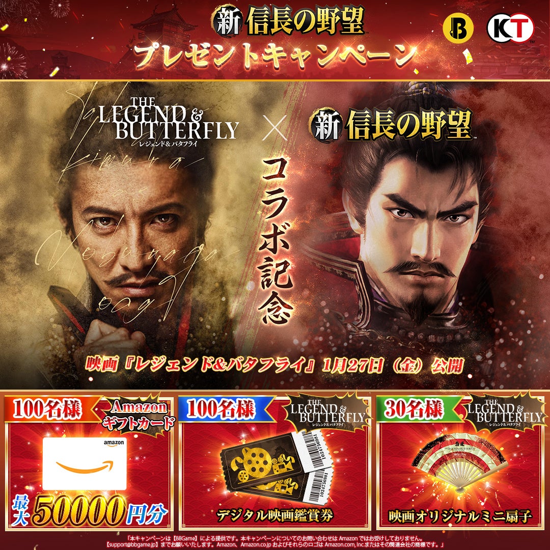 この記念すべき映画の公開に向けて、『新信長の野望』公式Twitterからプレイヤーの皆さまに最大50000円分のAmazonギフトカード100名様、映画『レジェンド&バタフライ』の「デジタル映画鑑賞券」50組100名様、さらに映画グッズ「映画オリジナルミニ扇子」30名様に抽選でプレゼントするキャンペーンを実施中!