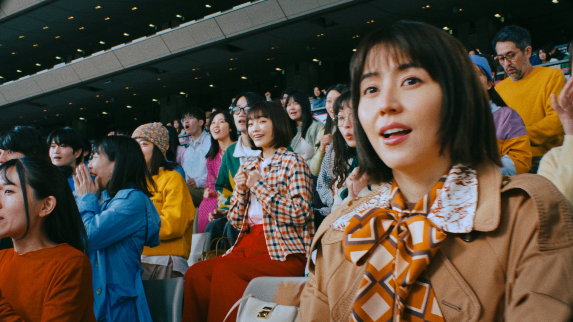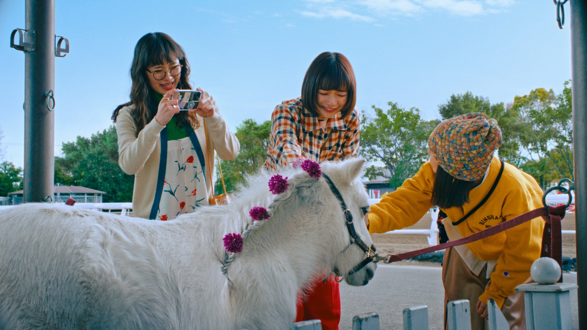 にぎやかな競馬場の正門付近。競馬場初心者の見上愛さんが、女性の友人2人と一緒にやって来ます。そんな見上さんの視線の先には、競馬場に慣れた様子の女性が。その女性こそ、先輩UMAJOの長澤まさみさんでした。