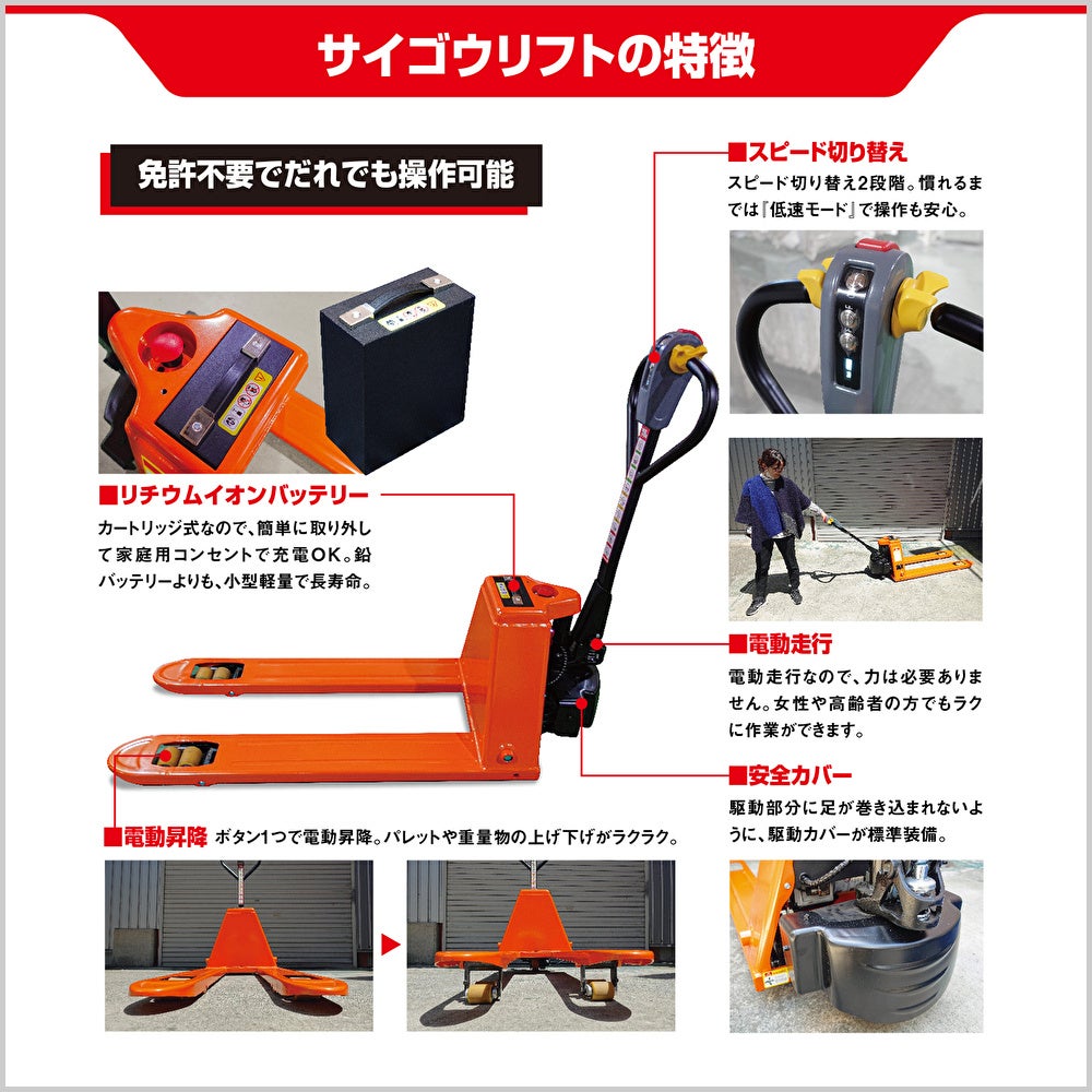 これらの問題を一気に解決できるのが「SAIGOWORKS(サイゴウワークス)」ブランドより発売した電動ハンドリフト「サイゴウリフト」です。サイゴウリフトはフォークの上昇・下降、パレットの移動をすべて電動でおこないます。ボタンとレバーで操作が可能で、操作する際に免許は必要ありません。また、移動に関しては安心して作業いただける低速モードが選べますので、初心者の方でもカンタンにお使い頂けます。