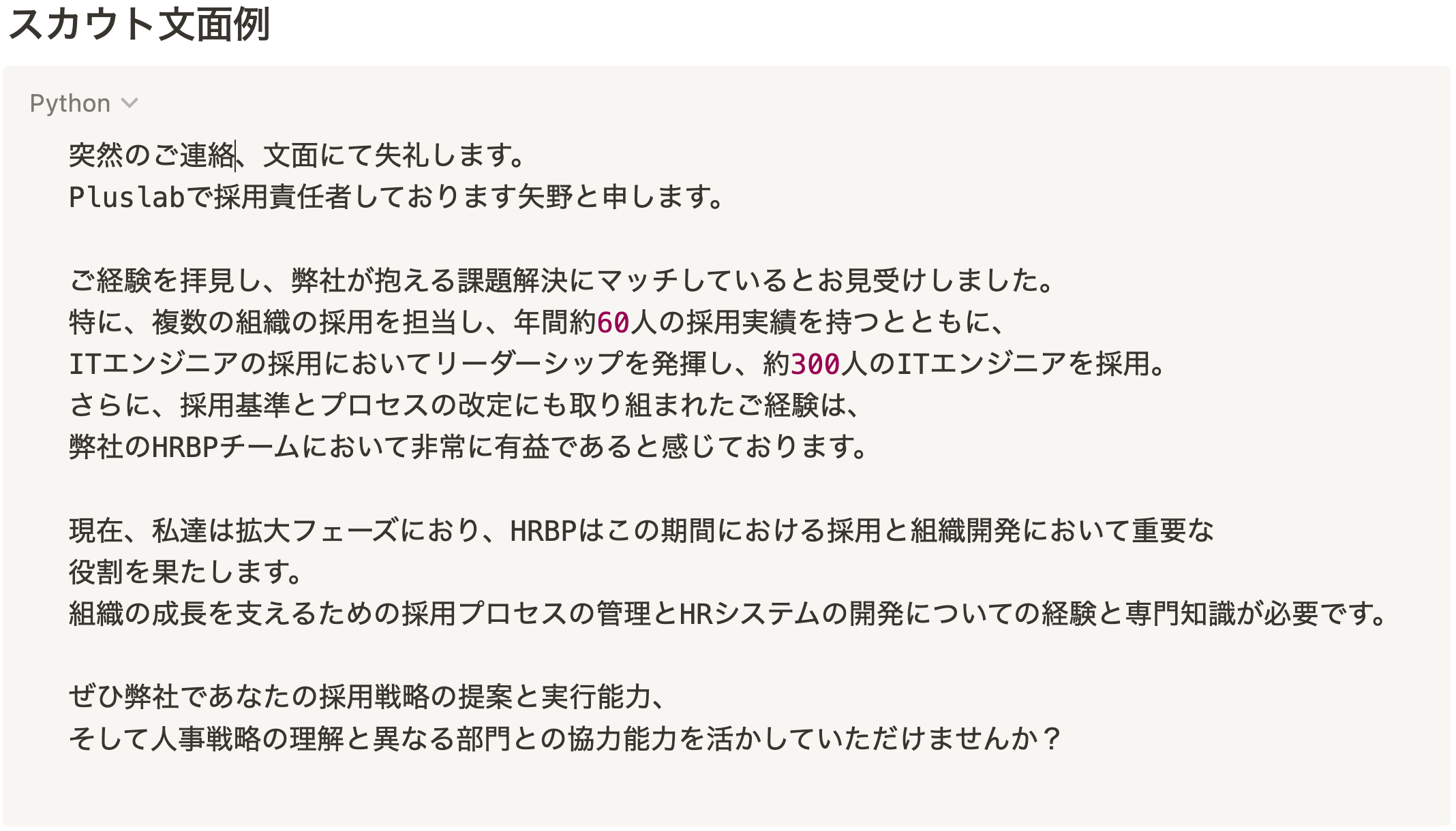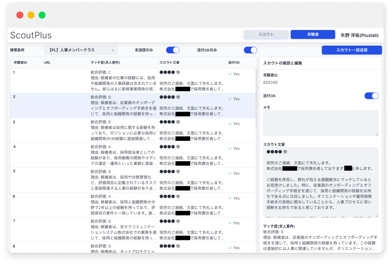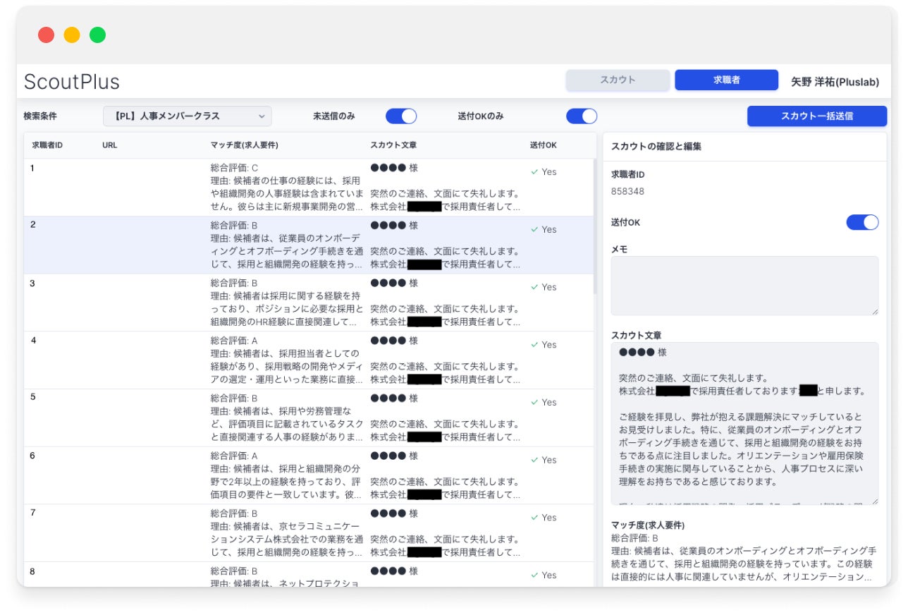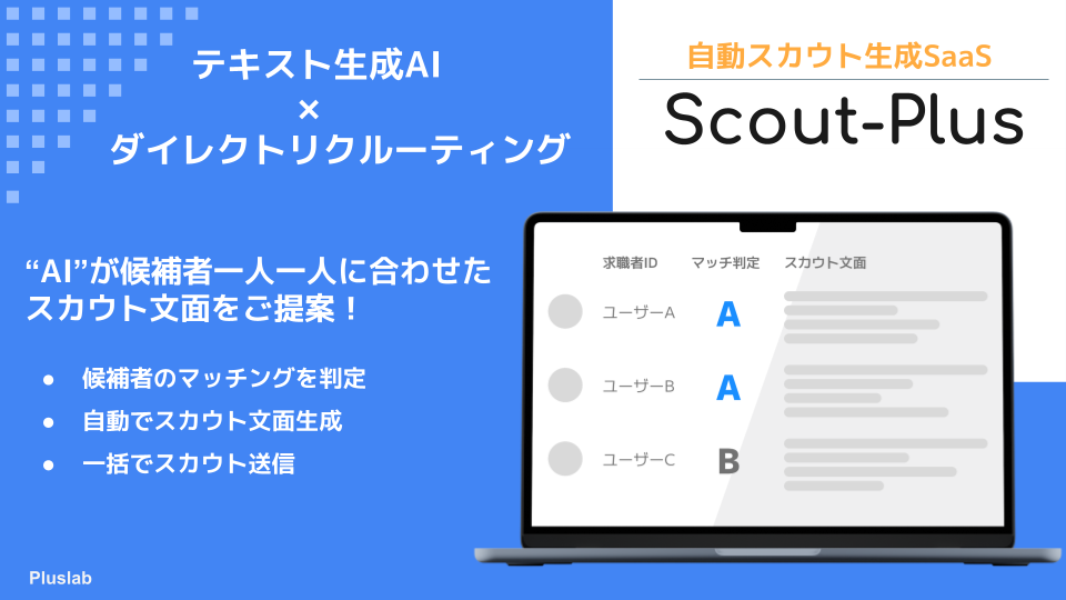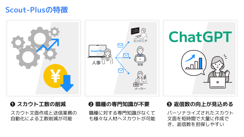 「Scout-Plus」はChatGPTを活用し候補者の選定やスカウト文面の作成の作成を自動化できるサービスです。