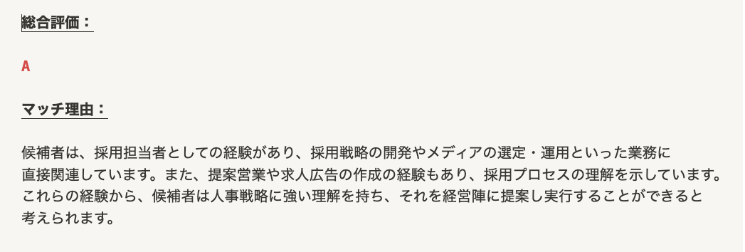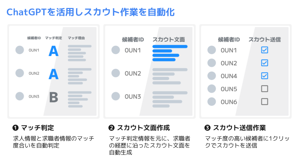 当サービスでは、ChatGPTを活用して、求人票と求職者の職務経歴情報を即座に解析し、マッチング率を計算します。これにより、より適格な候補者を素早く特定し、効果的なスカウト活動を行えます。