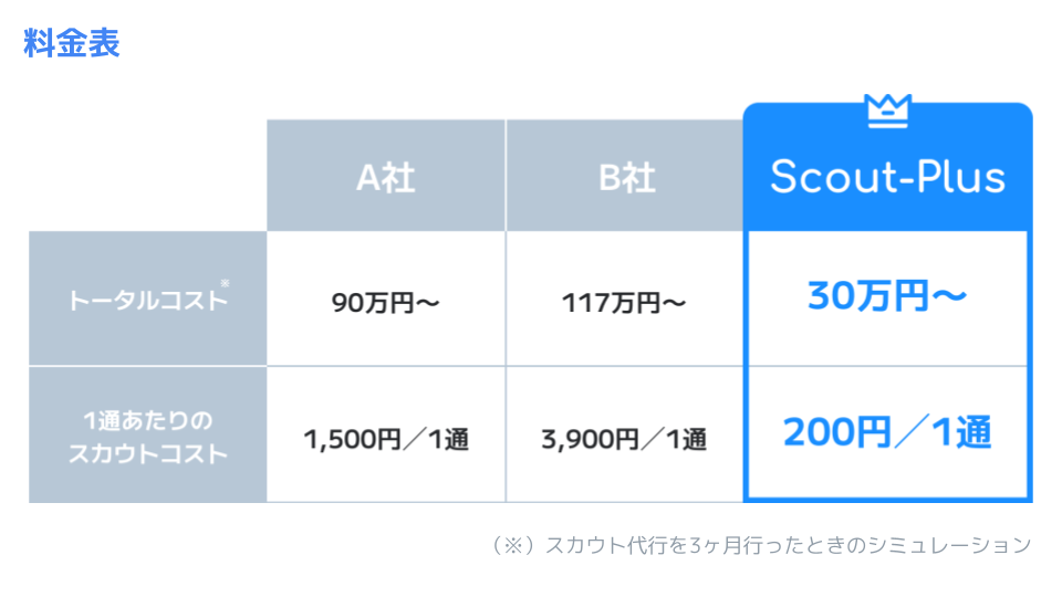 従来のスカウト代行サービスと同レベルの品質を維持しながら、より低価格でのスカウト代行サービスを提供いたします。
