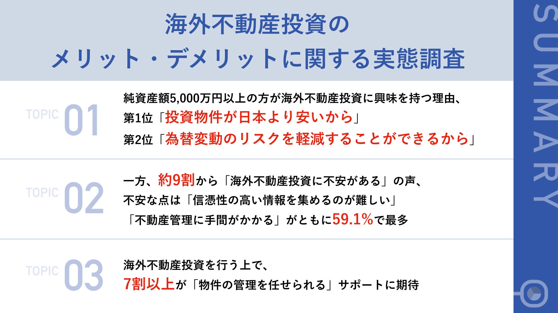 今回の調査では、海外の不動産市場に目を向ける方が増える中、その多くが海外不動産投資に対して不安を抱えている実態が明らかになりました。日本国内の不動産価格の高騰や、少子化による人口減少により、海外の市場に新たな機会を求める動きは、今後さらに活発化すると予想されます。一方、海外ということで、気軽に見にいけないことや法律の違いなども考慮した上での進行が求められることから、信頼性の高い情報や物件管理のサポートを提供するサービスへの期待は、より一層高まっていくのではないでしょうか。