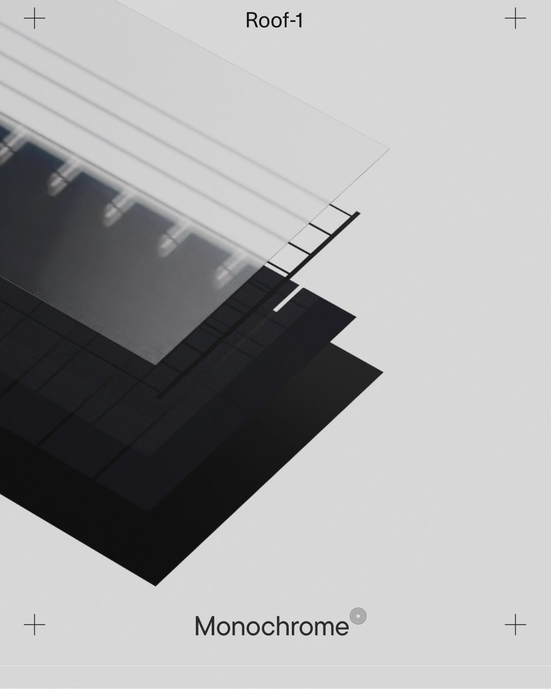 モノクロームが開発したRoof-1は、独自の特殊加工により太陽光発電モジュール全体の色を黒色とし、また黒色の金属屋根と一体化させた、太陽光パネルとわからないような美しい見た目の屋根材です。屋根一体型太陽光パネルとしてのRoof-1は3月中に一般販売を開始いたします。