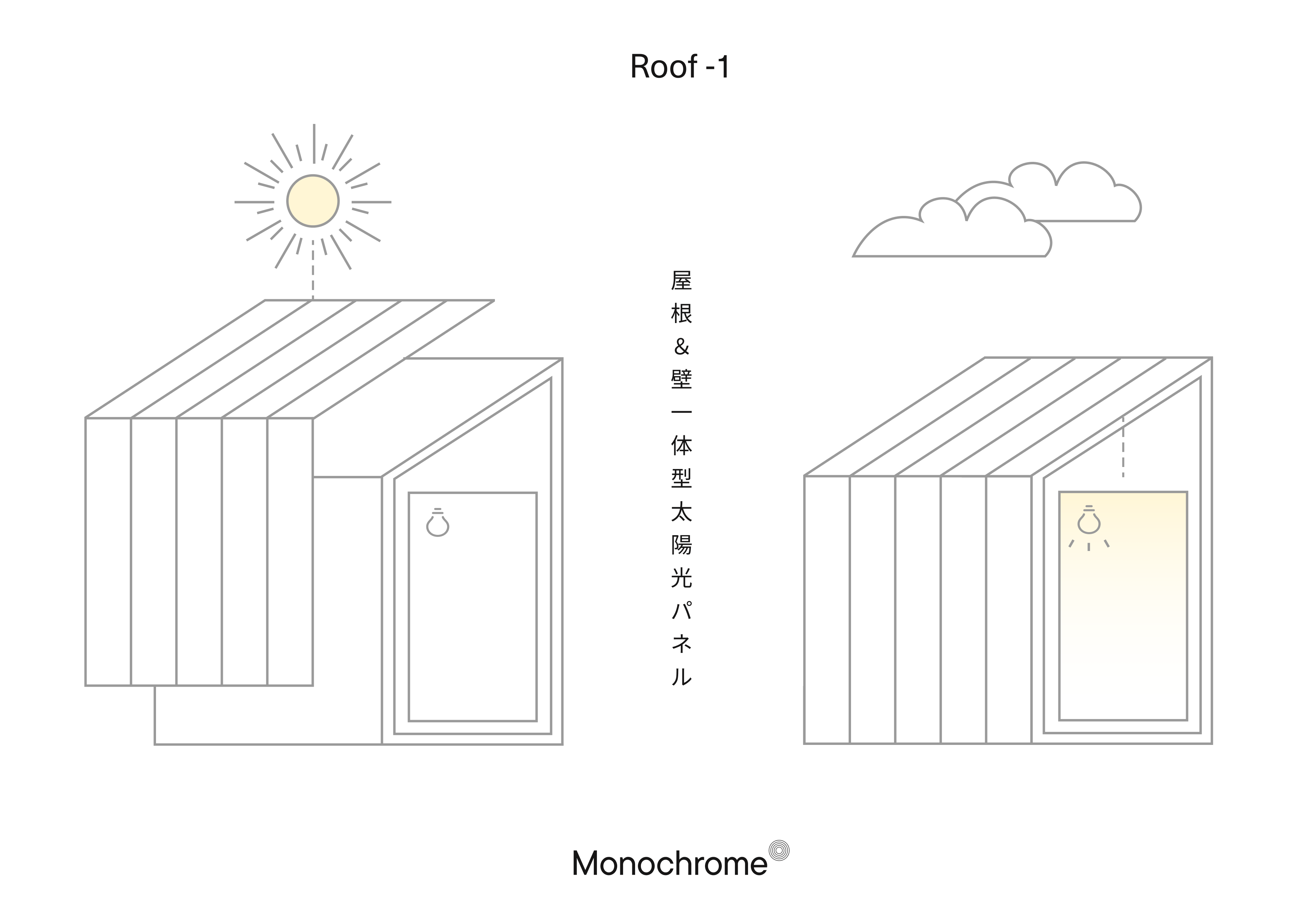 モノクロームは同社開発のエネルギーをつくる屋根”Roof-1”を”壁”&屋根一体型太陽光パネルとして、今回のMUJI HOUSEが開始するプロジェクトに技術提供を行い、2024年までの実用化に向けて実証実験の検証を開始します。