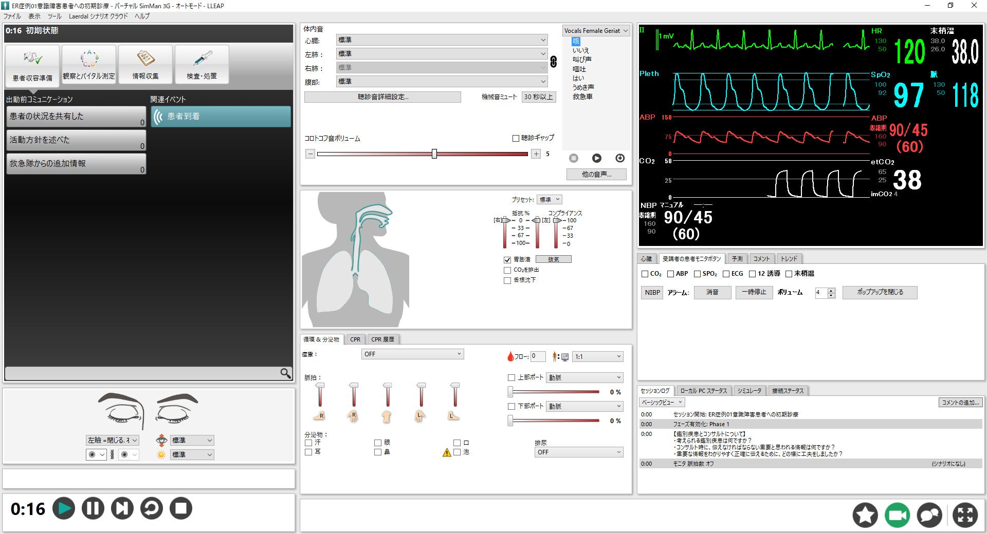 救急初期診療編では、救急外来で多く遭遇する症状の実践的なシナリオを東北大学病院高度救命救急センターと共同で考案し、シナリオに即して医療シミュレータを効率的に動作させる独自のデータとテキストを開発しました。