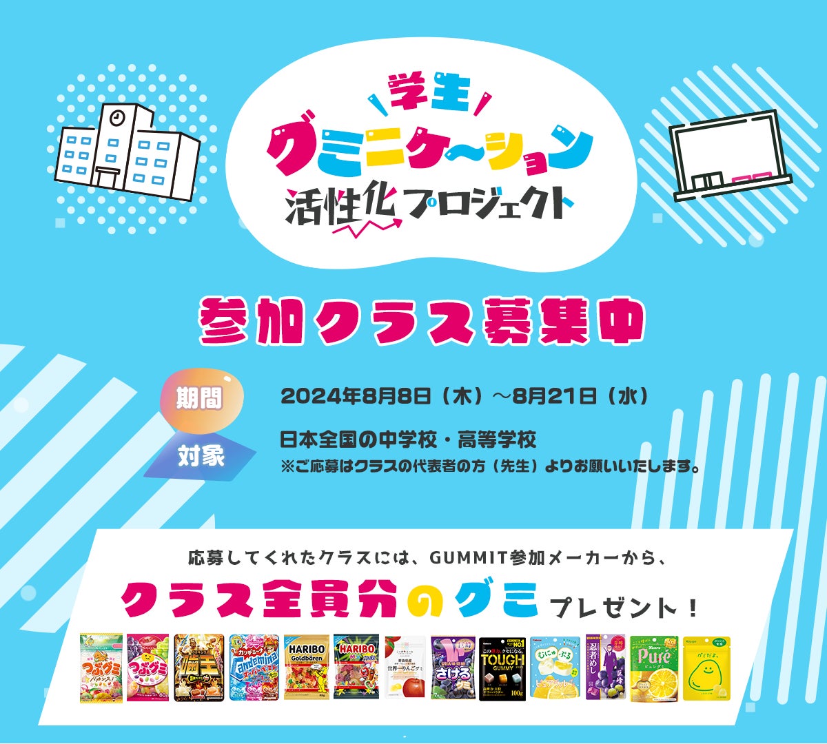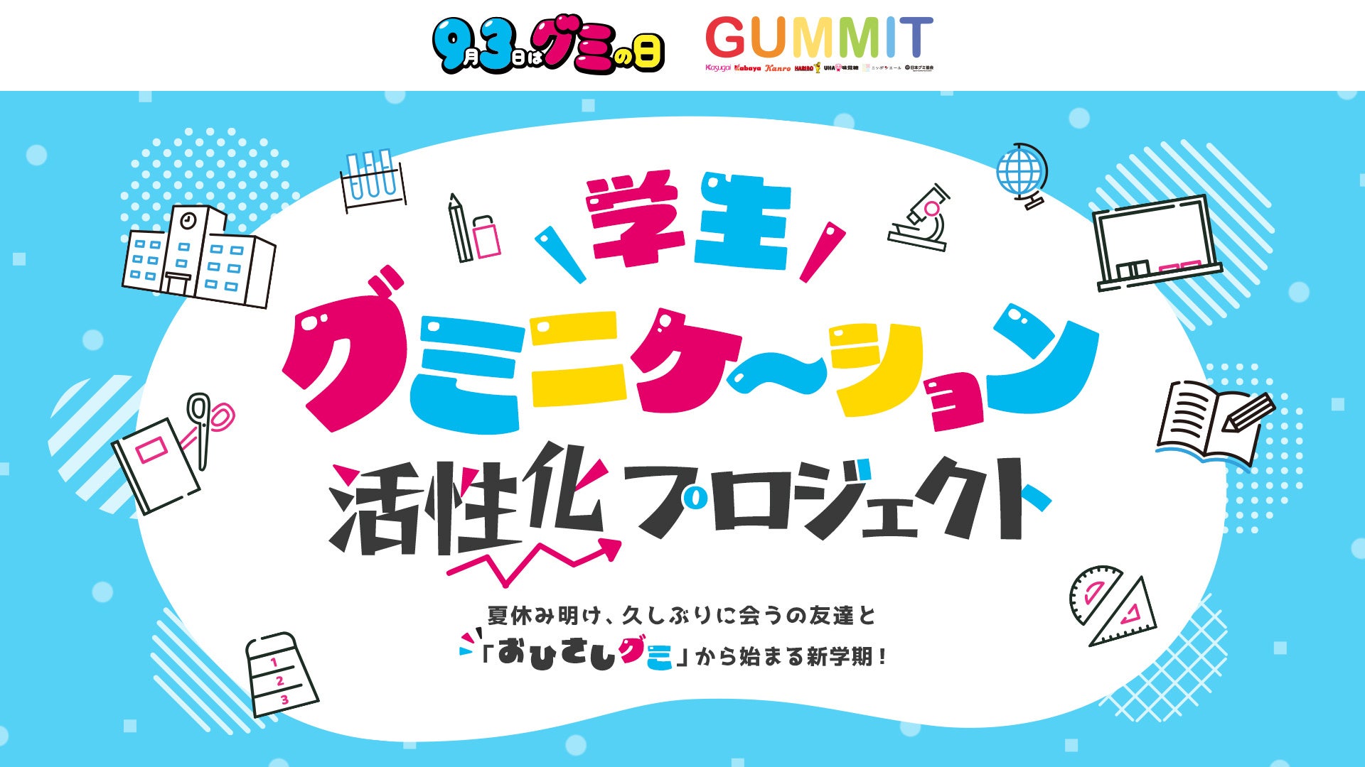 日本グミ協会は、グミを取り扱う国内関連企業からなるGUMMITとともに、9月3日のグミの日に向けて、新学期を迎える学生の間のコミュニケーションを活性化させる、「学⽣グミニケーション活性化プロジェクト」を始動いたします。本プロジェクト始動にともない、全国の中学・高校を対象に、GUMMIT参加メーカー6社のグミを配布する「クラスでレッツ!グミニケーション おひさしグミセットプレゼントキャンペーン」応募を開始いたします。