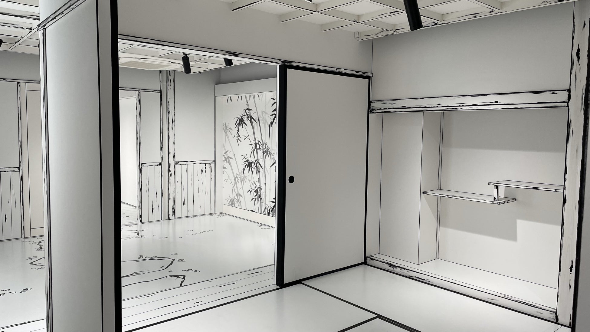 ヨーロッパにある「白黒カフェ」をヒントに、日本の古民家の部屋を白と黒で表現し、写真が撮れる内部と、ピンクの壁を背景に、黒猫のシルエット&白いハート、白い壁の背景には、漫画の吹き出し模様や、天使の羽といったカラフルな空間が楽しめます。