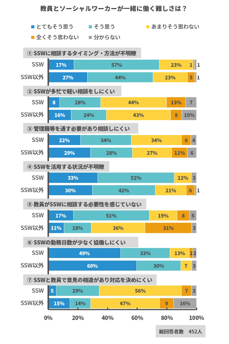 SSWと教員が一緒に働くことの難しさとして、「SSWの勤務日数が少なく協働しにくい」「SSWを活用する状況が不明瞭」「SSWに相談するタイミング・方法が不明瞭」が多く選択されていました。「教員がSSWに相談する必要性を感じていない」については、SSWの68%が「とてもそう思う」「そう思う」と回答していたのに対して、SSW以外では29%に留まりました。この点は、SSWとSSW以外の教職員で認識の違いがあるようです。
