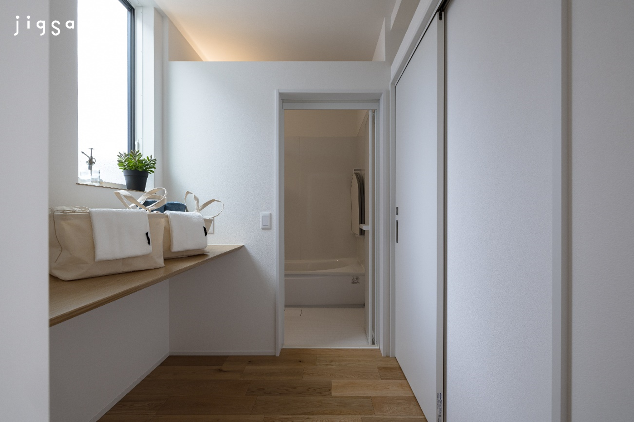 高気密住宅の弱点である「湿度不足」の問題に関して、浴室から出る蒸気を利用することで年間を通して湿度50%を目指します。浴室に加湿器の役割を持たせ、室内の加湿まで計画的に考えた設計になっています。
