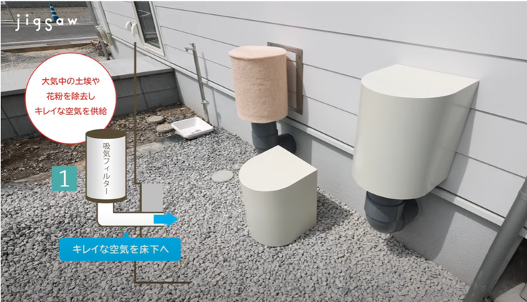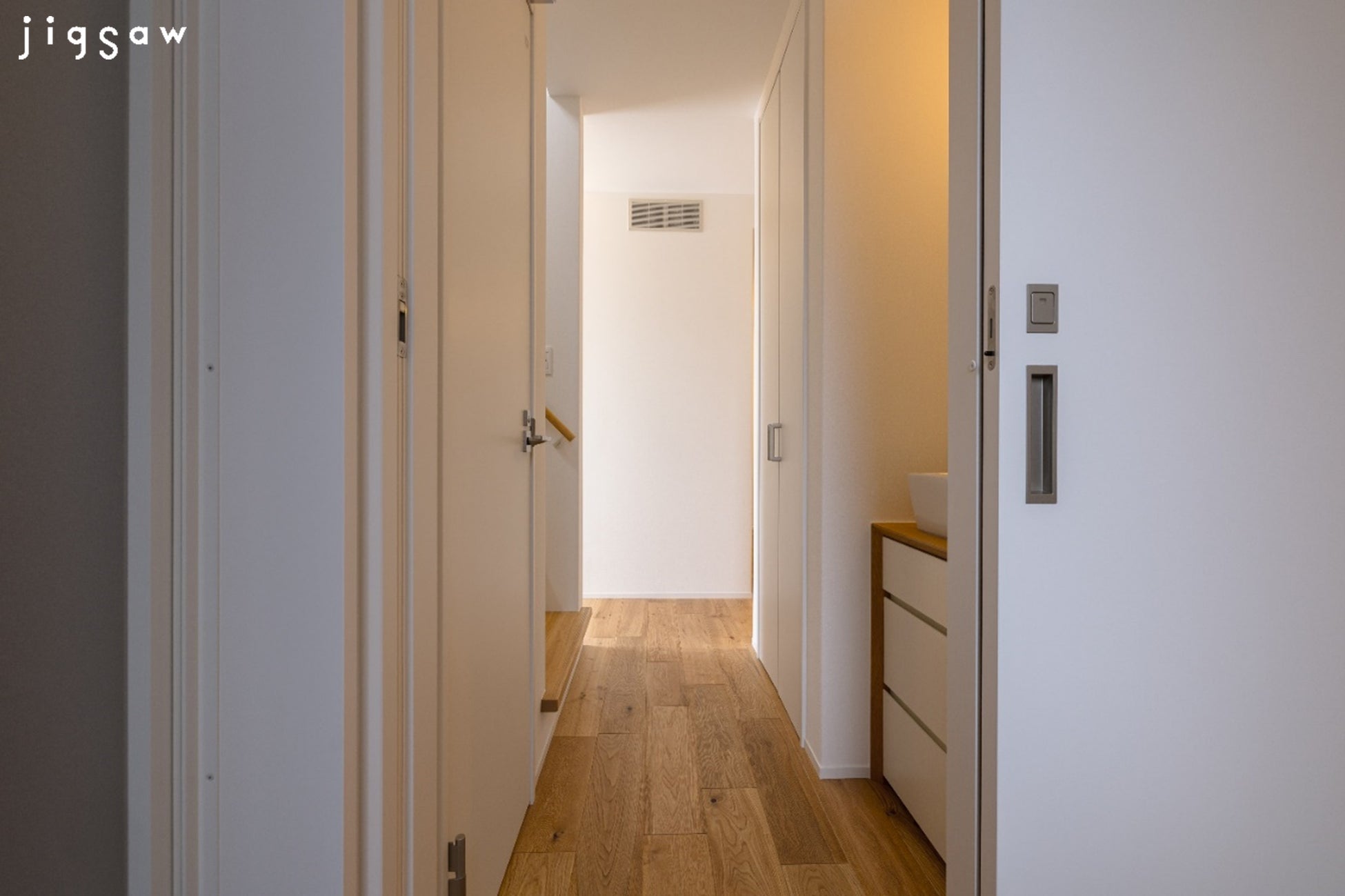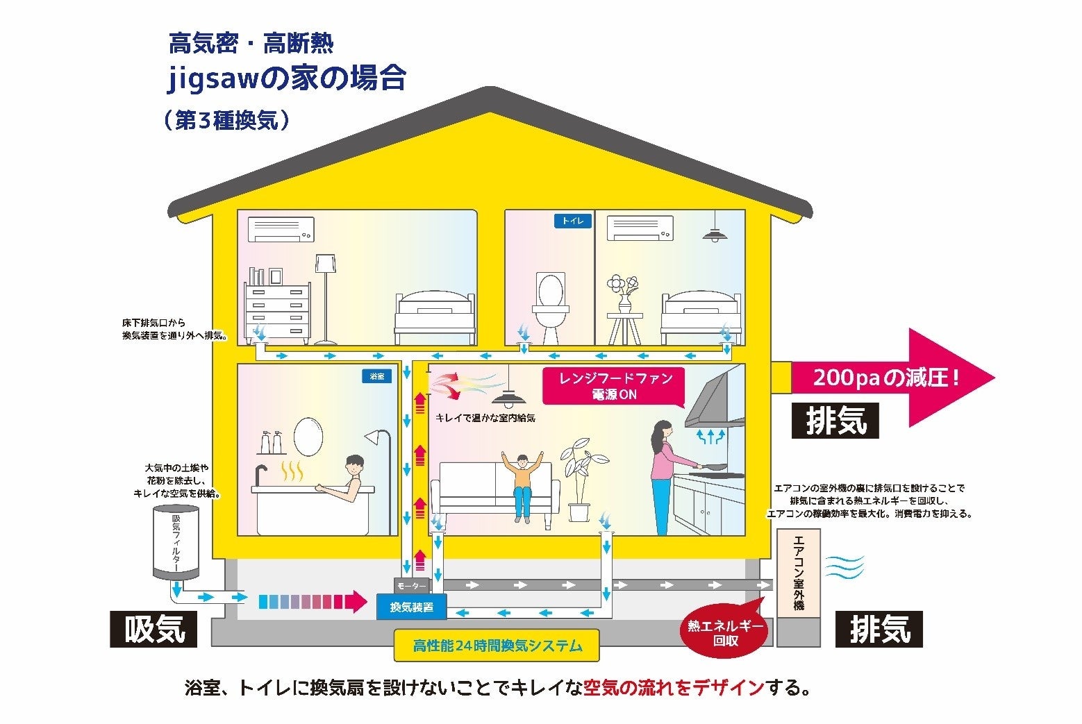 jigsawの住宅では吸気口を1か所に設け、浴室、トイレに換気扇を設けないことで換気扇からの空気の逆流というリスクをなくしています。高性能24時間換気システムによって空気の流れをデザインした、すべてが計画された住宅です。