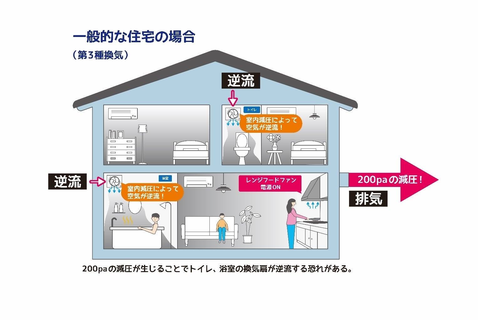 一般的な高気密住宅では浴室やトイレに換気扇が設けられており、圧力の強いレンジフードを使用すると室内減圧により空気が逆流してしまう恐れがあります。
