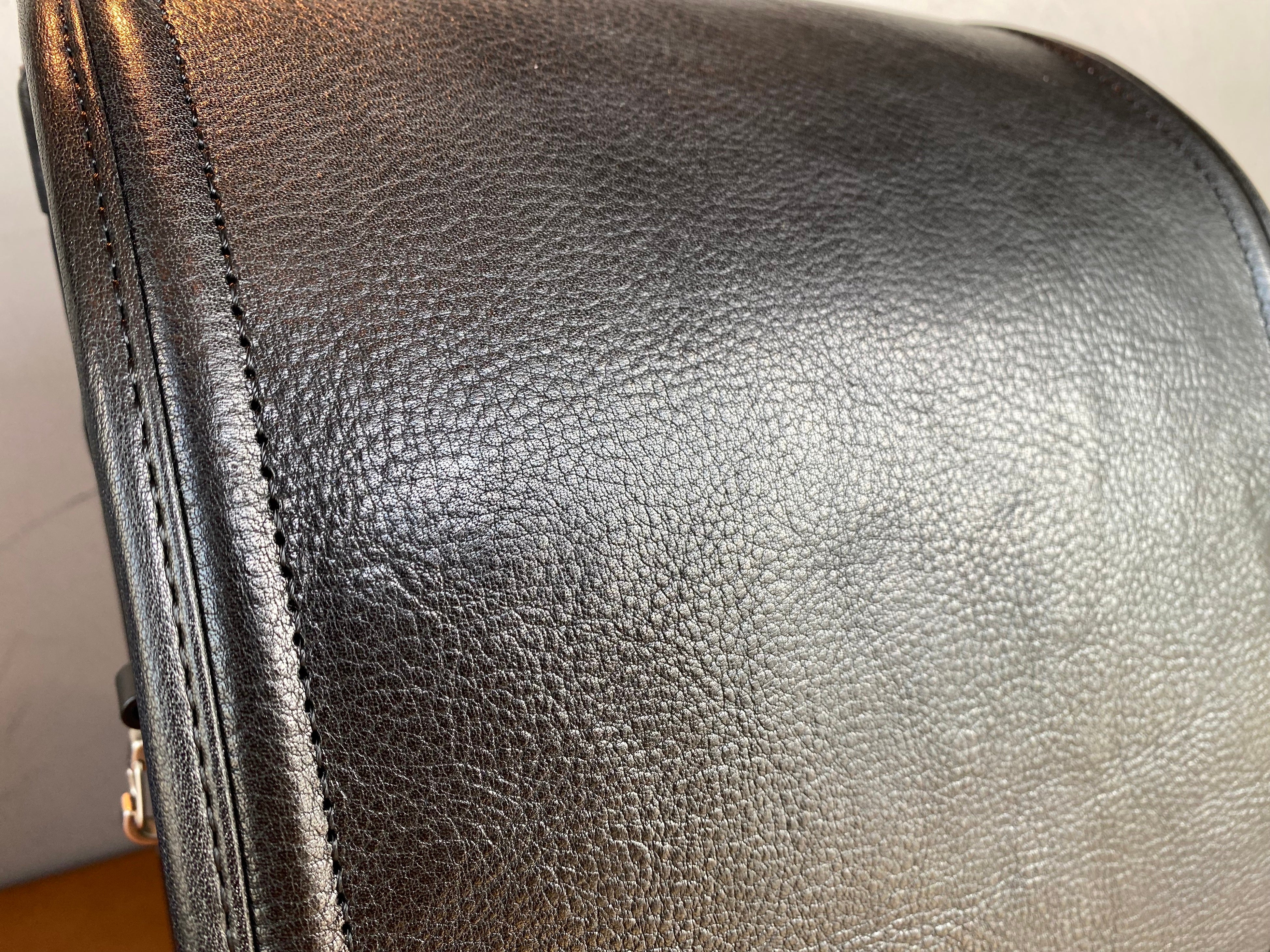 凹凸の質感が特徴的な黒い皮革の「UZU」は、合成タンニン鞣(なめ)し、染料で仕上げながらも、シュリンク(シボだし)することで立体感を表現。 独特のコシと経年変化を楽しめる皮革です。