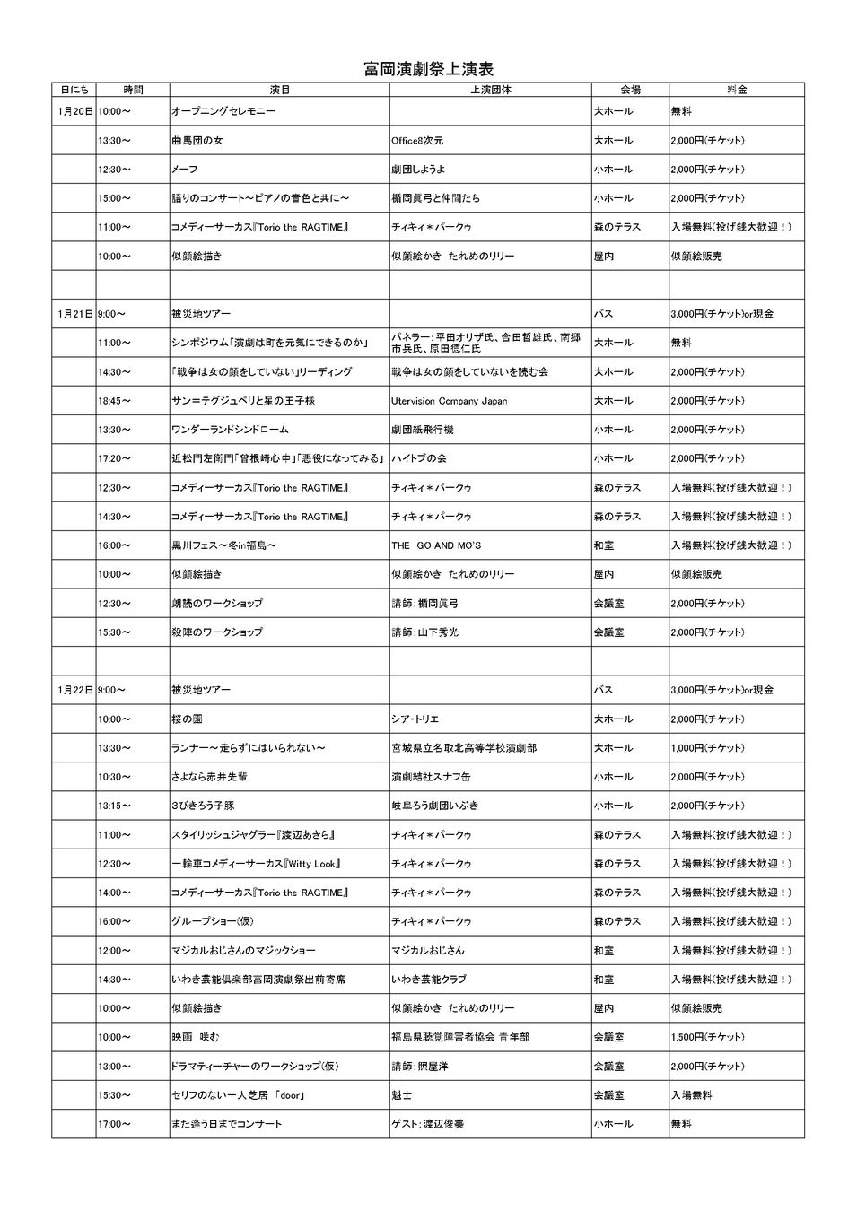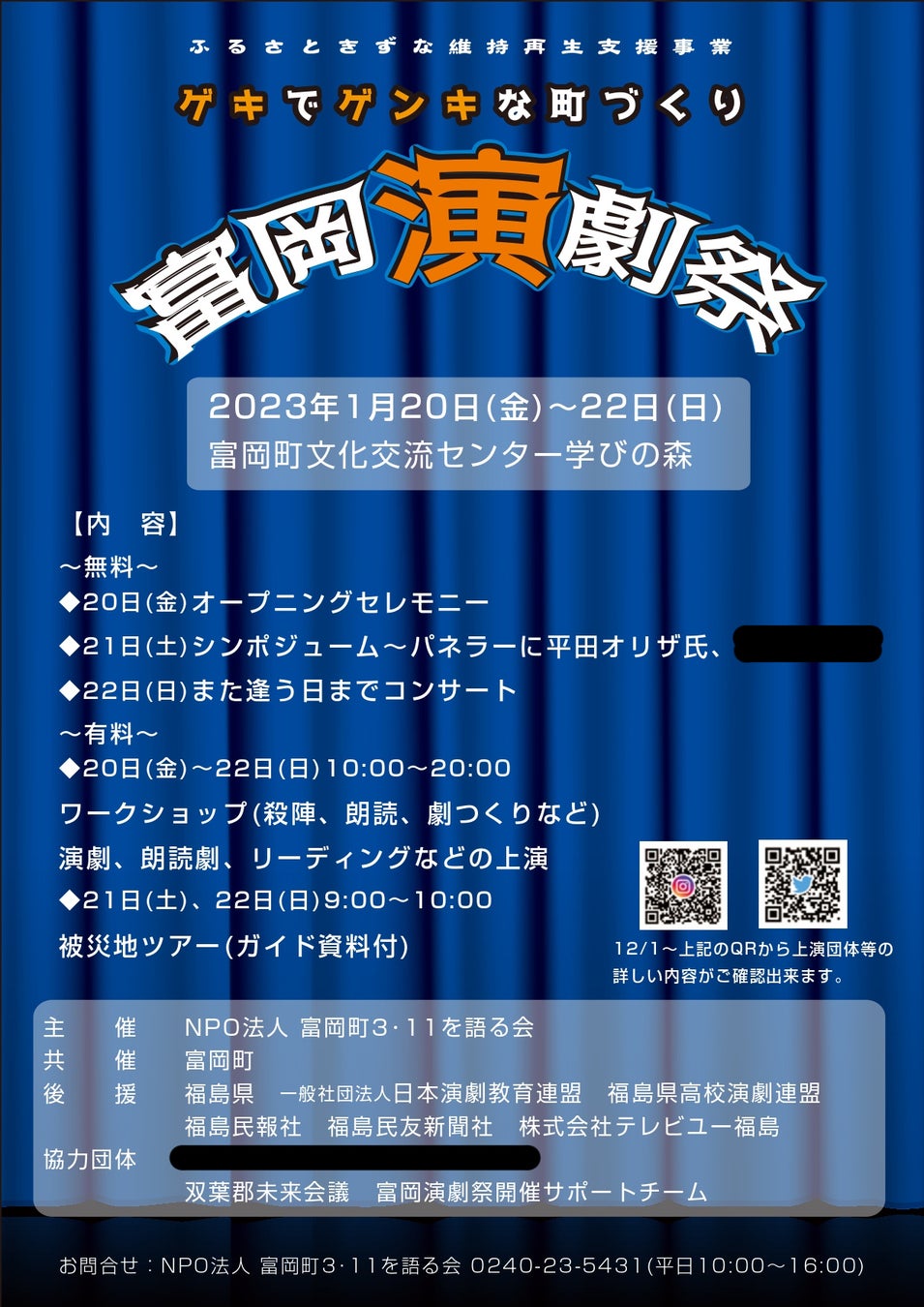 NPO法人富岡町3.11を語る会(福島県双葉郡富岡町中央3-53 代表 青木 淑子 ℡0240-23-5431)は、富岡町で東日本大震災・原子力災害の伝承活動をしている。人を育成するための表現の1つである「演劇」で町を元気にできないかと考え、富岡演劇祭を開催をする。2023年1月20日~22日