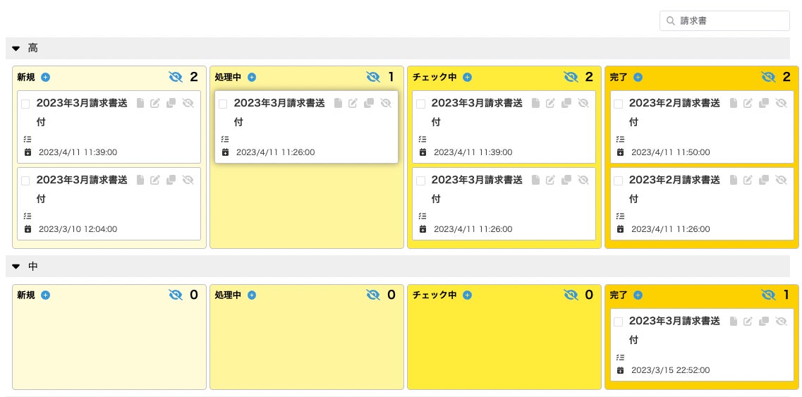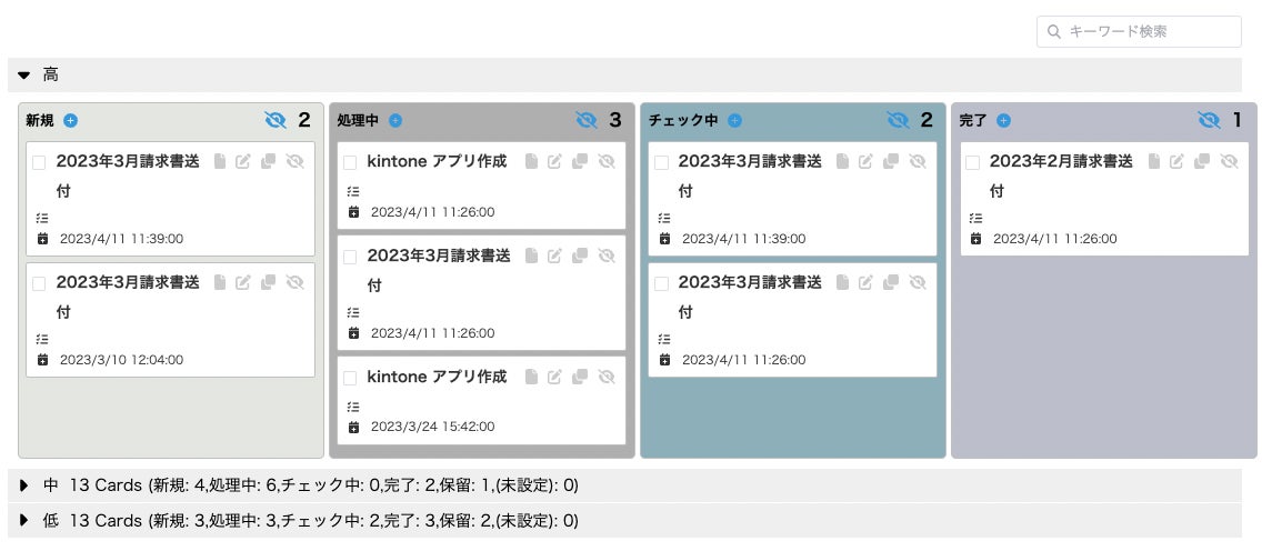 Crena独自の機能としてスイムレーン機能があります。この機能により、カンバンの表示をより細かく分類することができ、タスクの進捗状況を可視化することができます。たとえば、「高」「中」「低」といったスイムレーンを設定することで、タスクを優先度でグルーピングしてボードを表示できます。