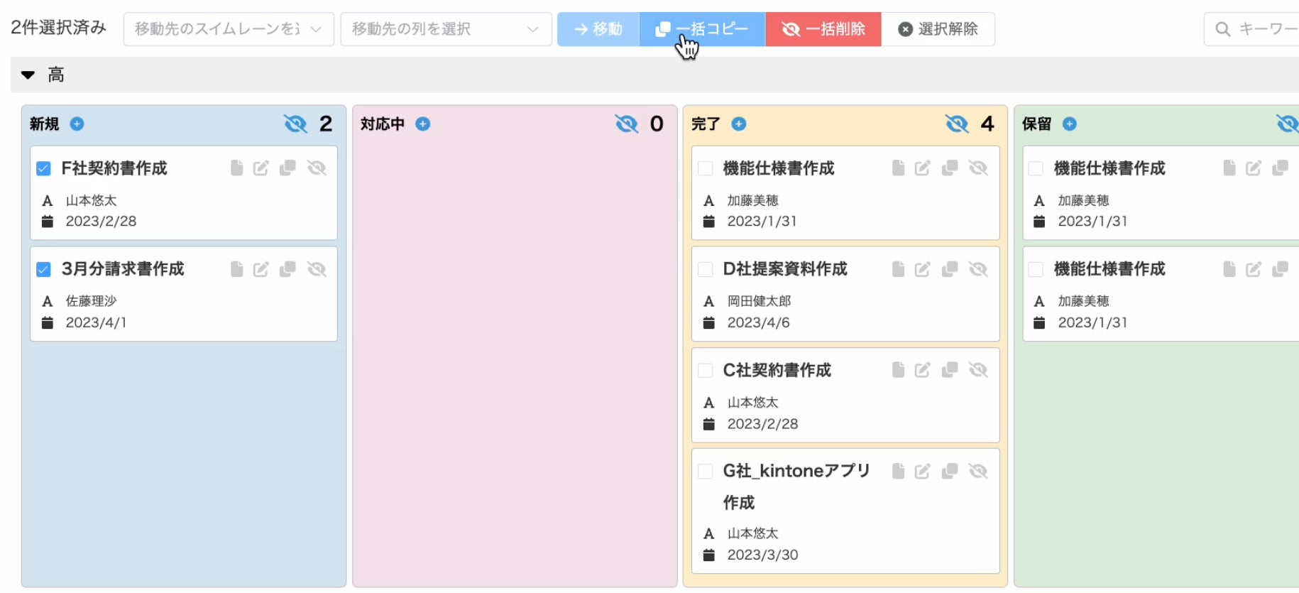 選択したカードを一括で移動・複製・削除する機能です。この機能を使うことで複数のタスクをまとめて進捗状況を変更したり、複製したり削除したりすることができます。これにより、カードを何度も移動・複製・削除する必要がなくなり、作業効率が向上します。