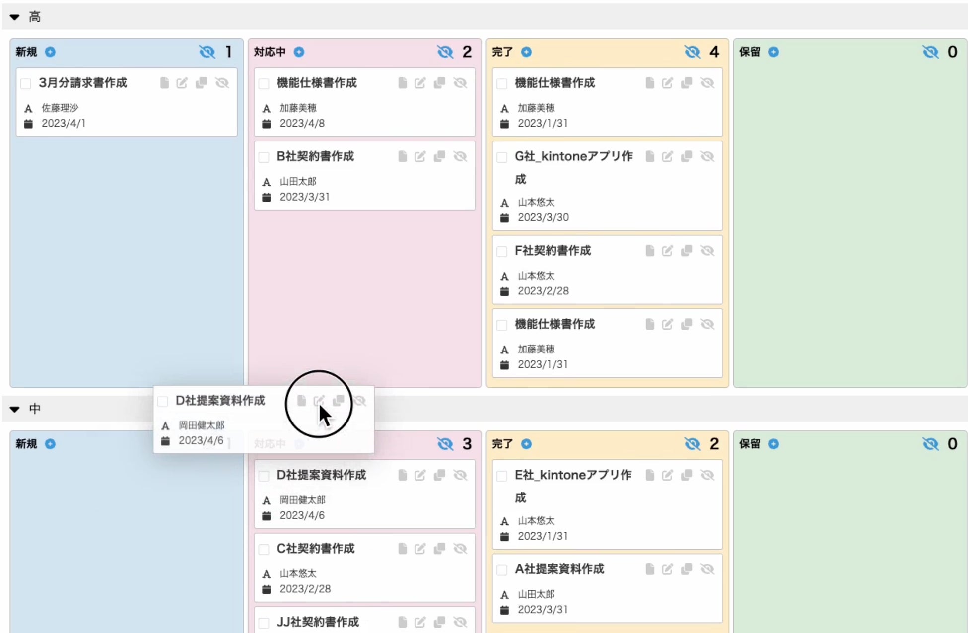 カンバンのカードをドラッグ&ドロップで移動できる機能です。タスクのステータスや優先順位を簡単に変更することができます。これにより、プロジェクトの進捗状況をリアルタイムで把握し、優先順位を調整することができます。kintoneのレコードを編集する手間や時間を節約することができます。