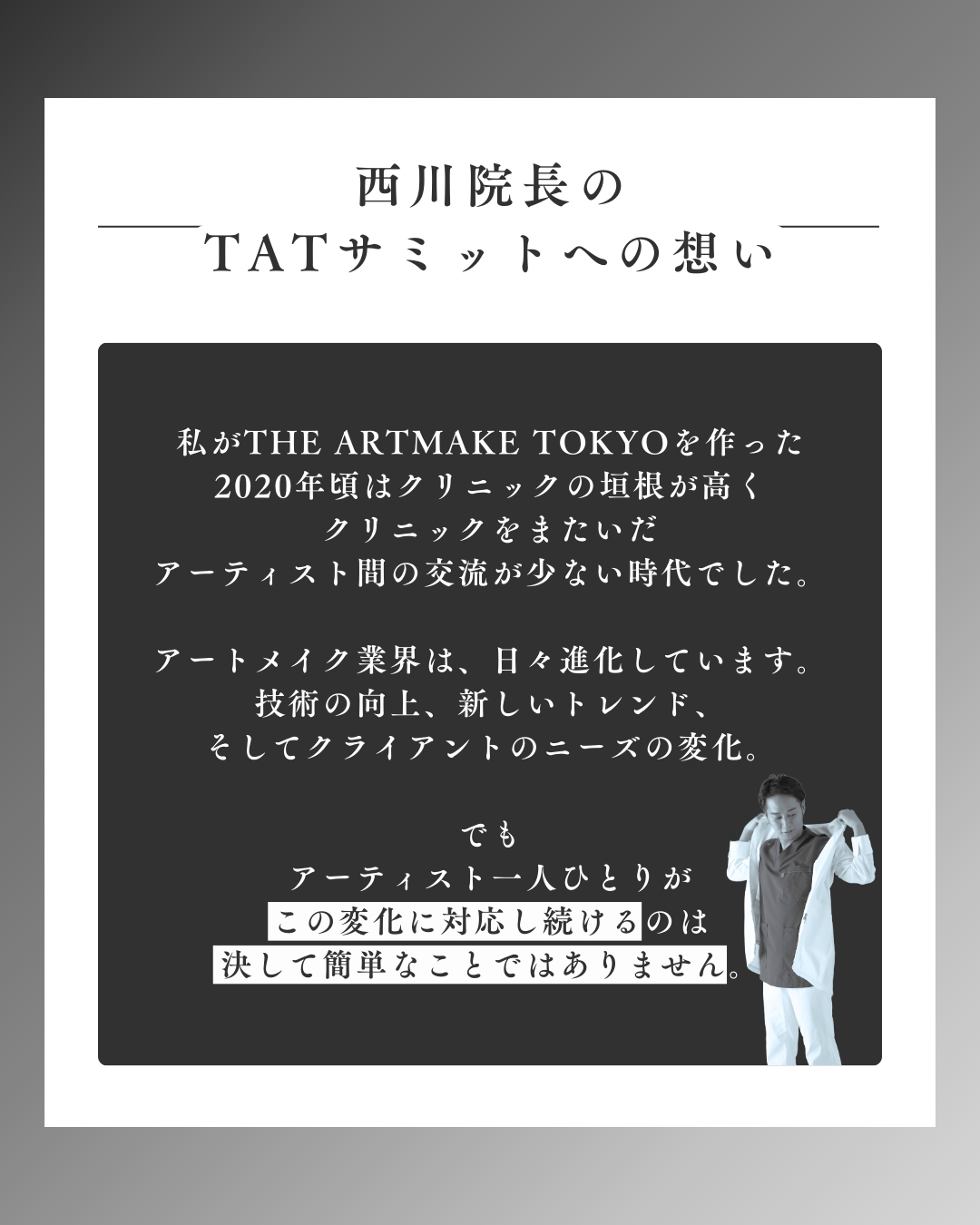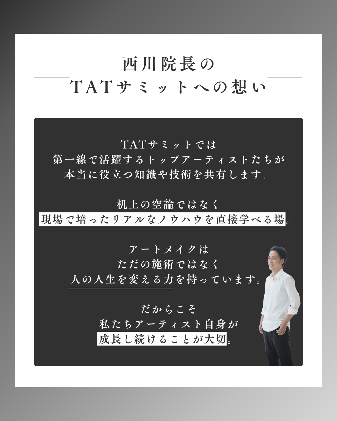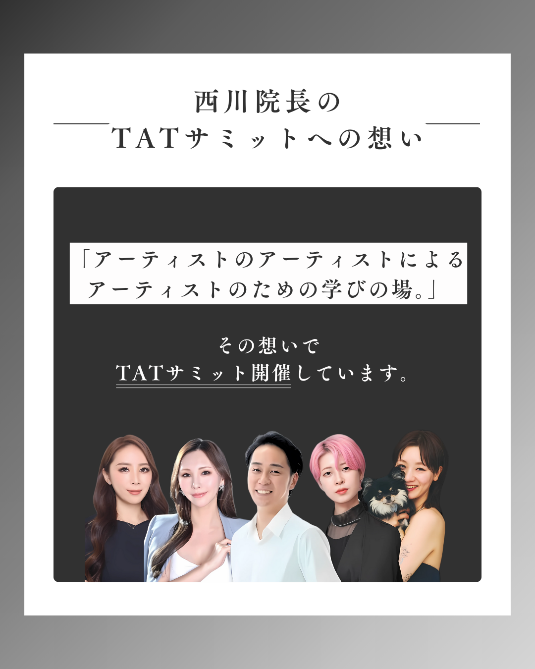 最新のアートメイク技術とアートメイクの未来を探るイベント「The Artmake Tokyo サミット(TAT SUMMIT)」が、2025年3月24日(月)に東京・日本橋ホールにて開催されます。本イベントでは、検索しても出てこない、登壇者ならではの経験に基づく唯一無二のストーリーが語られ、アートメイクの可能性をより深く追求する場となります。