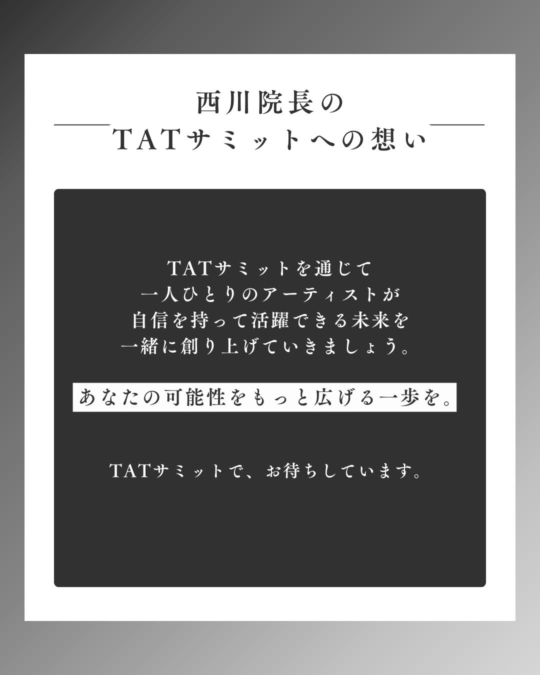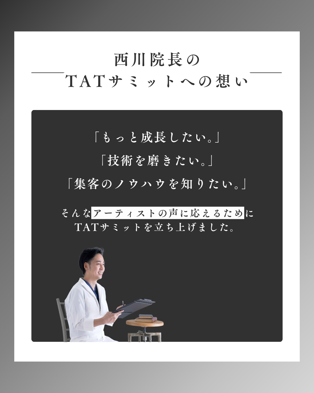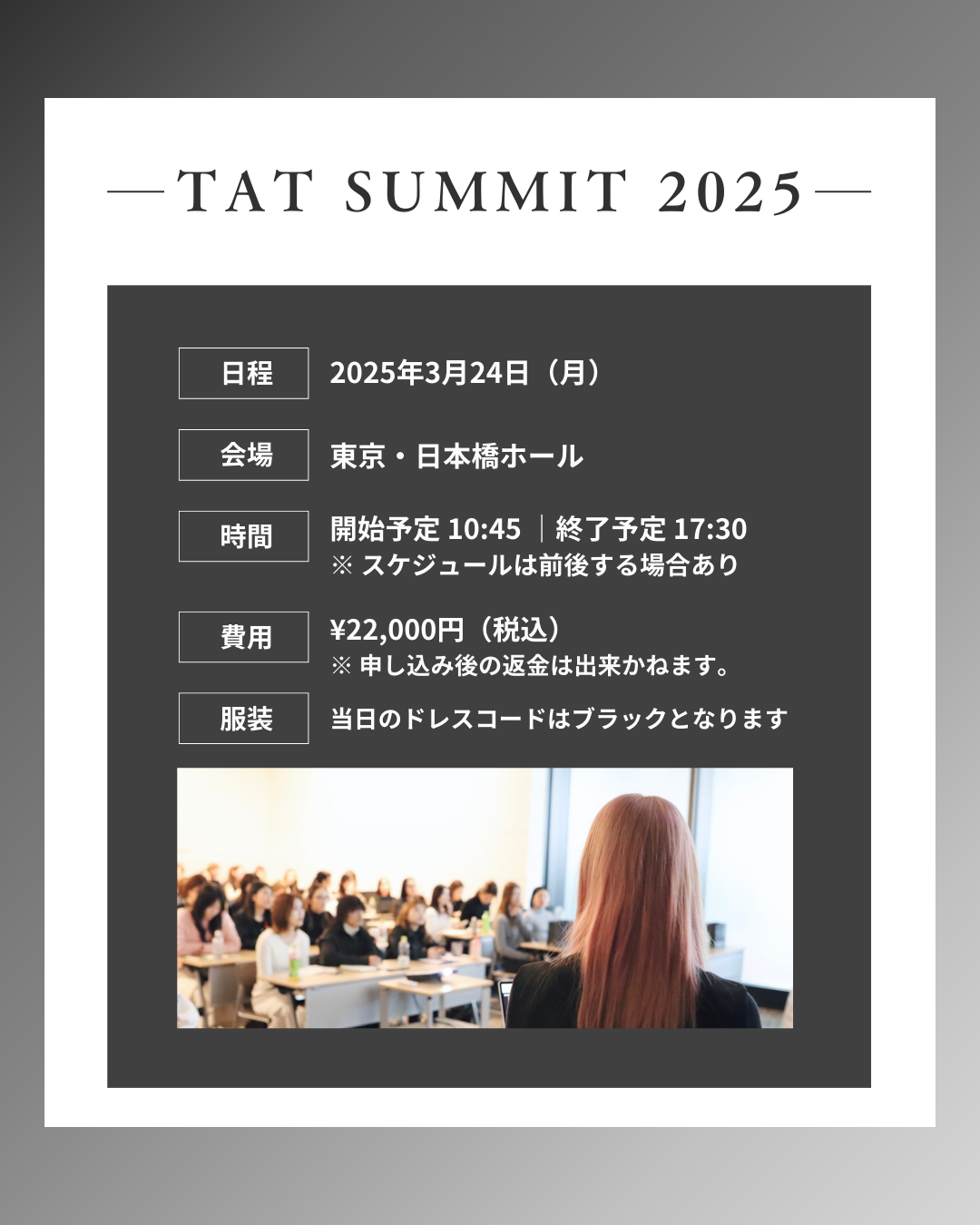 最新のアートメイク技術とアートメイクの未来を探るイベント「The Artmake Tokyo サミット(TAT SUMMIT)」が、2025年3月24日(月)に東京・日本橋ホールにて開催されます。本イベントでは、検索しても出てこない、登壇者ならではの経験に基づく唯一無二のストーリーが語られ、アートメイクの可能性をより深く追求する場となります。