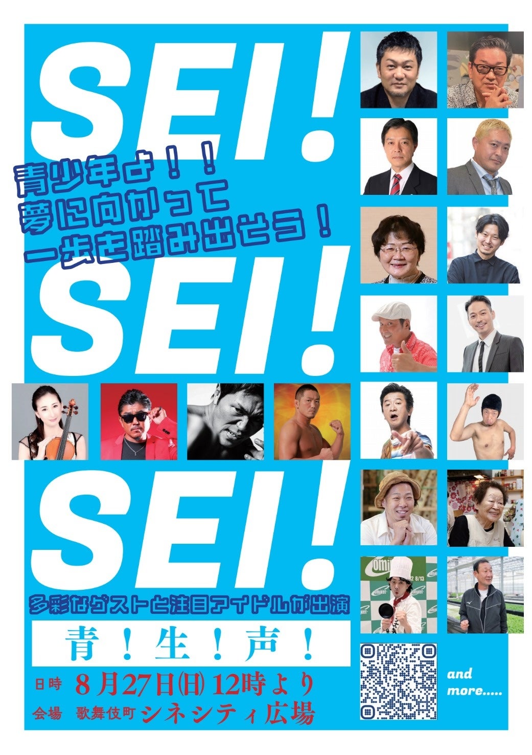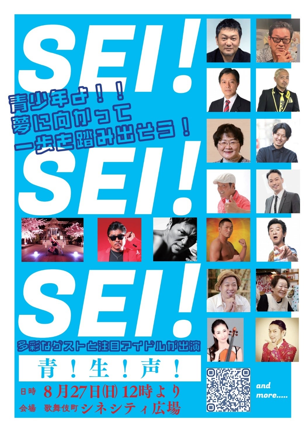 歌舞伎町の発展と青少年の健全な育成と地域活性化プロジェクト「SEI!SEI!SEI!〜青!生!声!〜」を8月27日(日) 12時より、歌舞伎町シネシティ広場で開催(参加費〈入場料〉無料入場)。