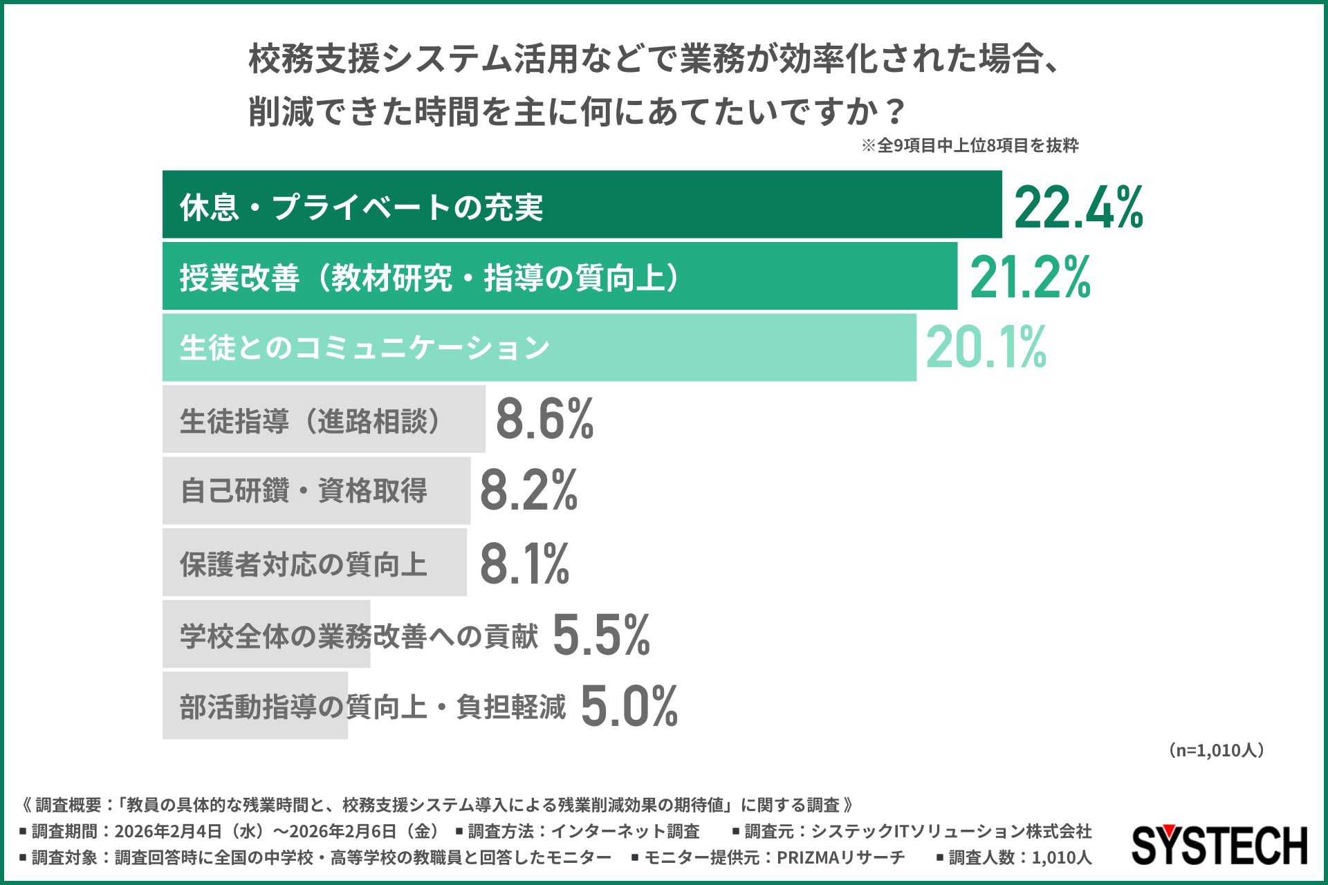『休息・プライベートの充実』が最多となりましたが、現状の疲労度の高さを物語っていますが、『授業改善(教材研究・指導の質向上)』や『生徒とのコミュニケーション』も上位になり、「本来やるべき教育活動に時間を使いたい」という意欲を持っていることがわかります。