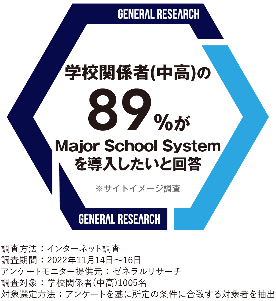 校務支援システム導入を検討中の学校関係者の89%が「Major School System」について『導入したい』と回答したフルカスタマイズ可能な高校・中高一貫校向けの校務支援システムパッケージです。