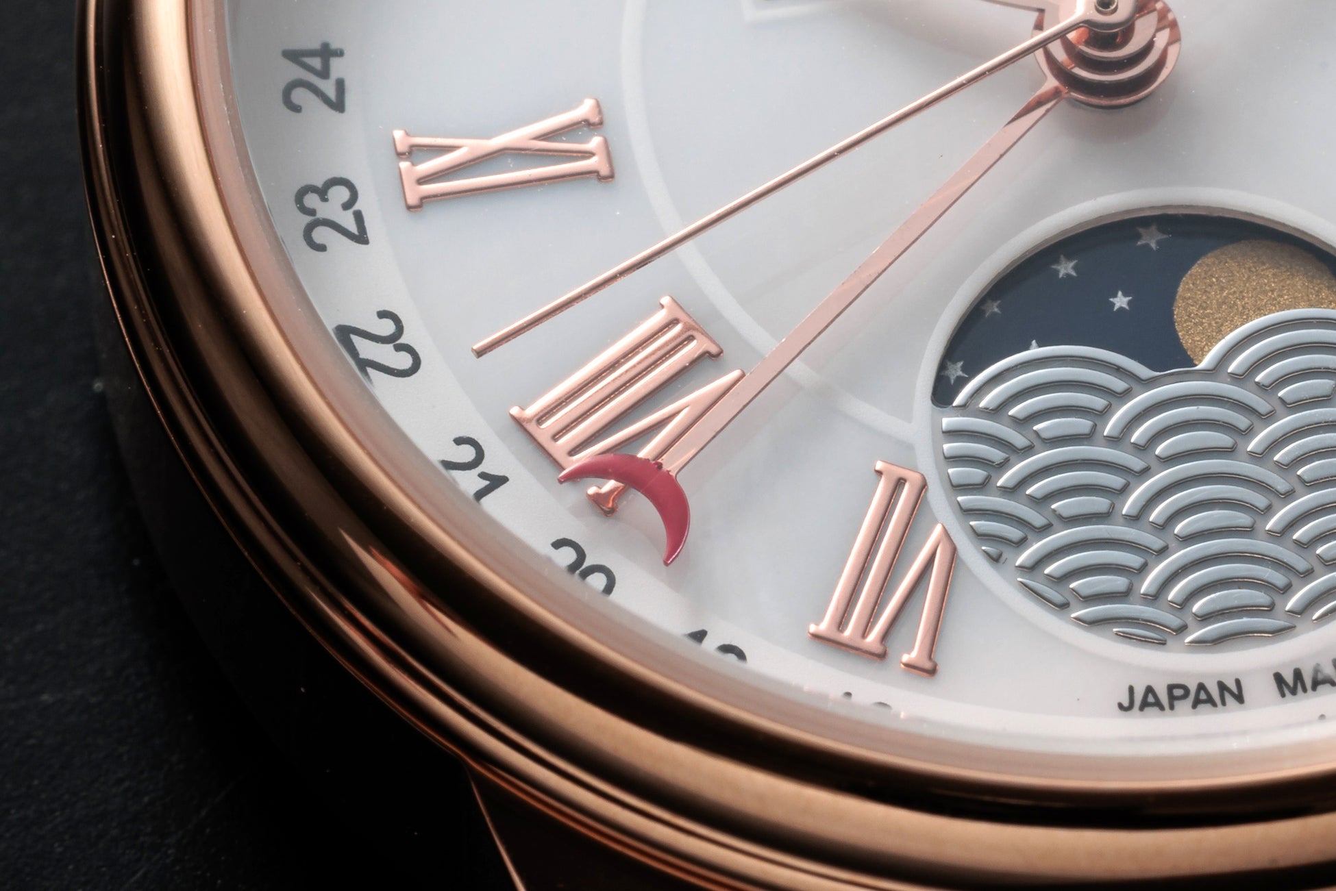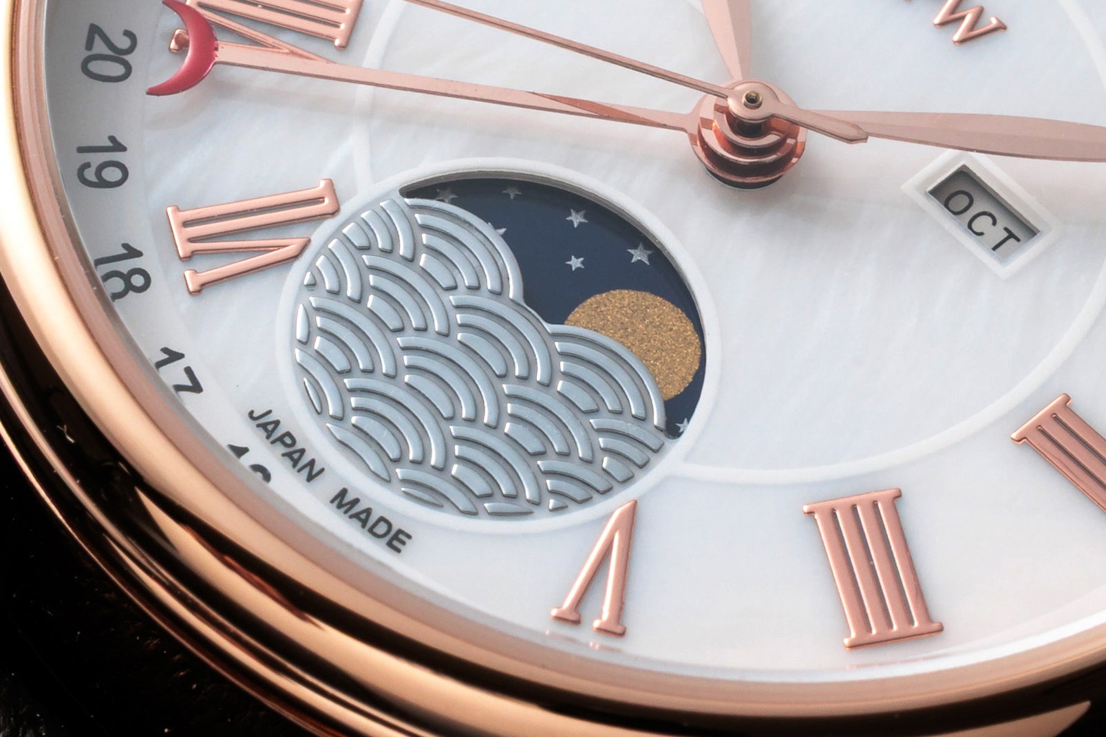 ムーンフェイズの表示部には「青海波(せいがいは)」という、平安時代から存在すると言われている日本の伝統的な文様の装飾を施しました。